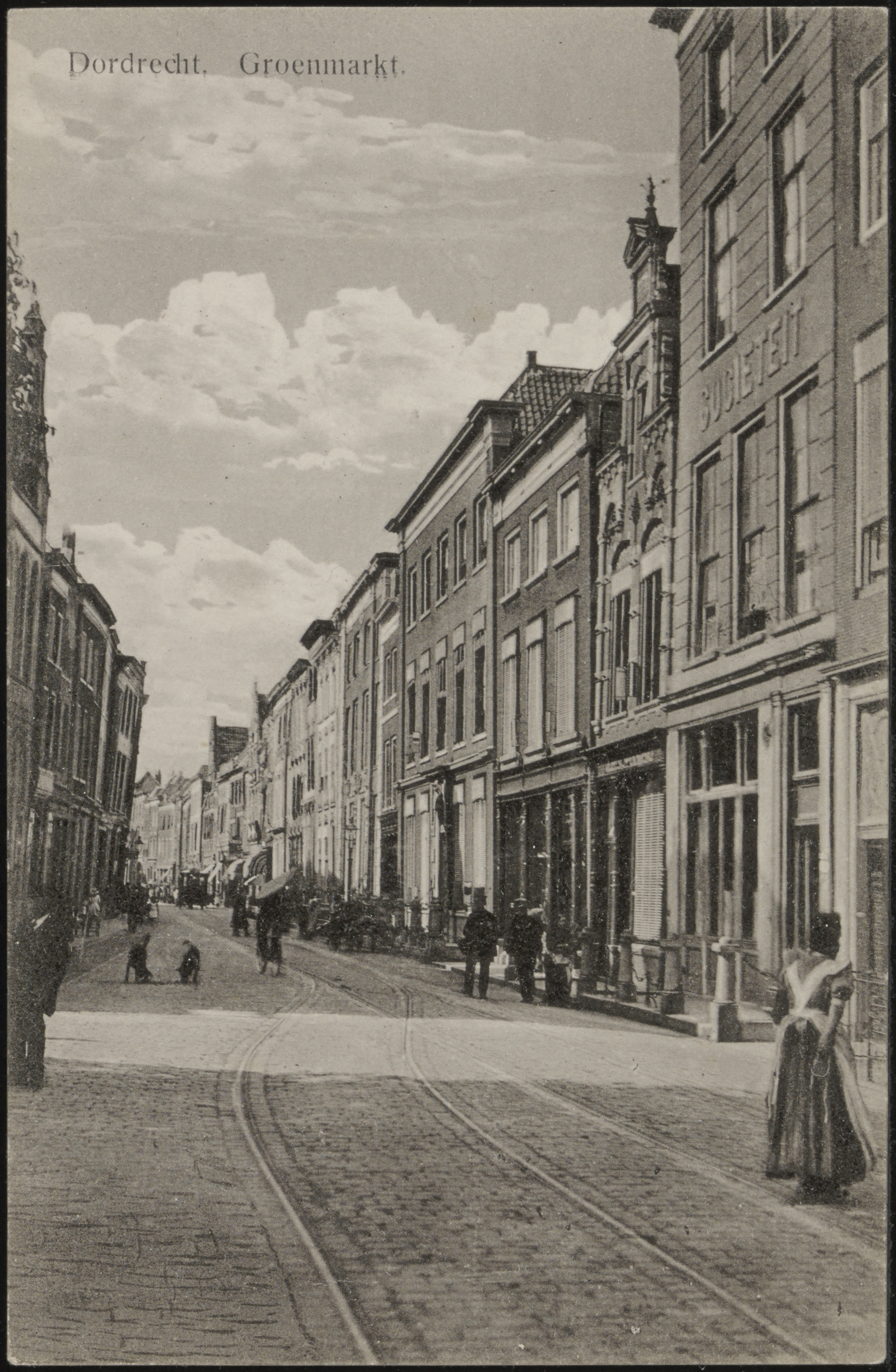 - Groenmarkt vanaf het Scheffersplein richting Visbrug. Rechts de sociëteit en dansschool Hans Eijskoot. De rails zijn van de paardentram.