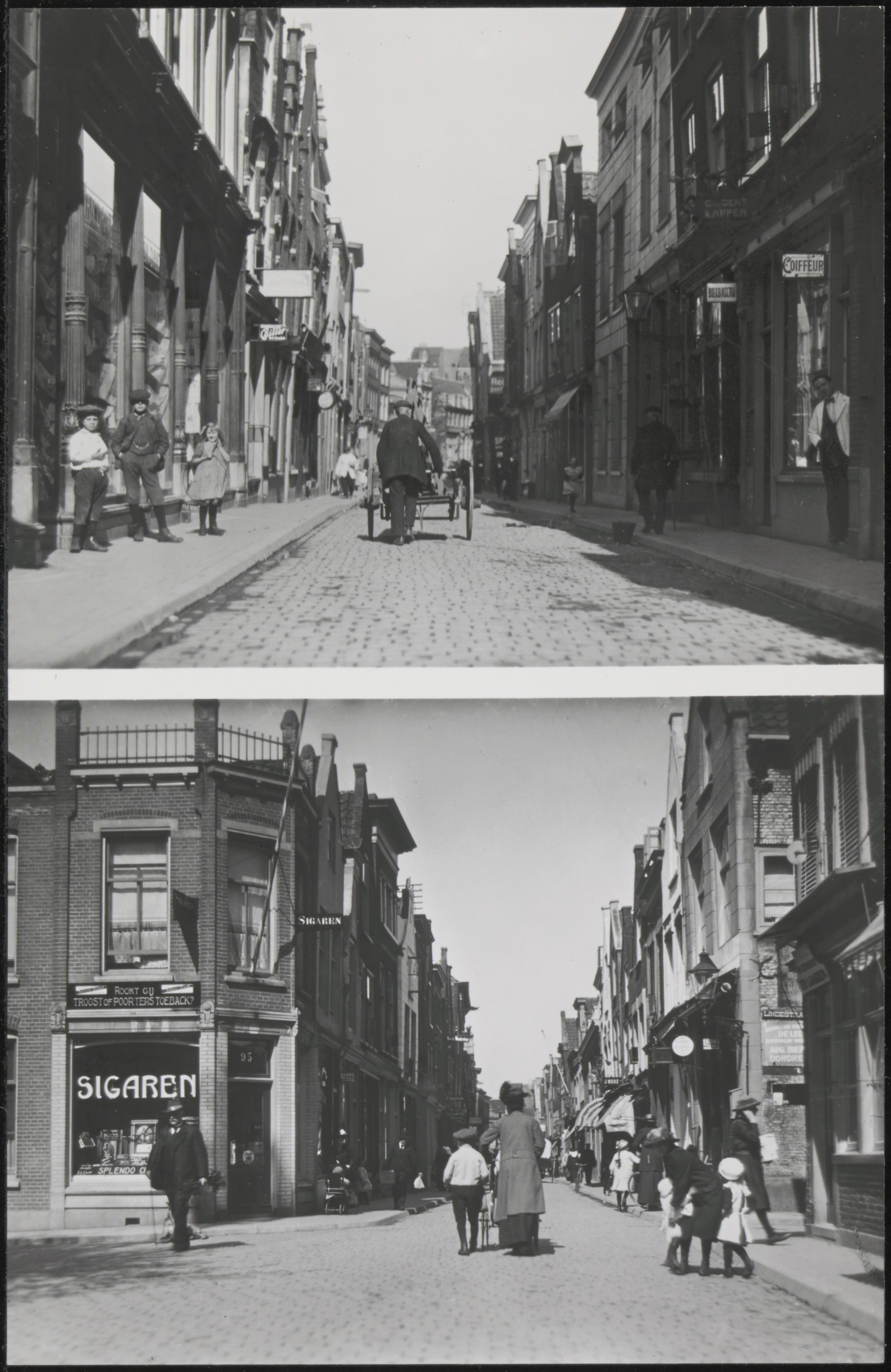 Links zie je de manufacturenwinkel van J. van Dantzig aan de Vriesestraat 63-65, nu 75. (552_303473). Vanaf de Pelserbrug bocht de Voorstraat naar links, hier gaat het naar rechts. De kapperszaak rechts is van G. van Gent, Vriesestraat 72, nu Fotohuis Modern op nummer 82. Geheel op de achtergrond zie je dat hoge pand met onderbroken dak, dat staat rechts van de poort van het oude mannenhuis op nummer 15. Zie https://goo.gl/maps/DQEwvxVGMt4vCchn7 Zie ook 552_404799 en 552_404800.
