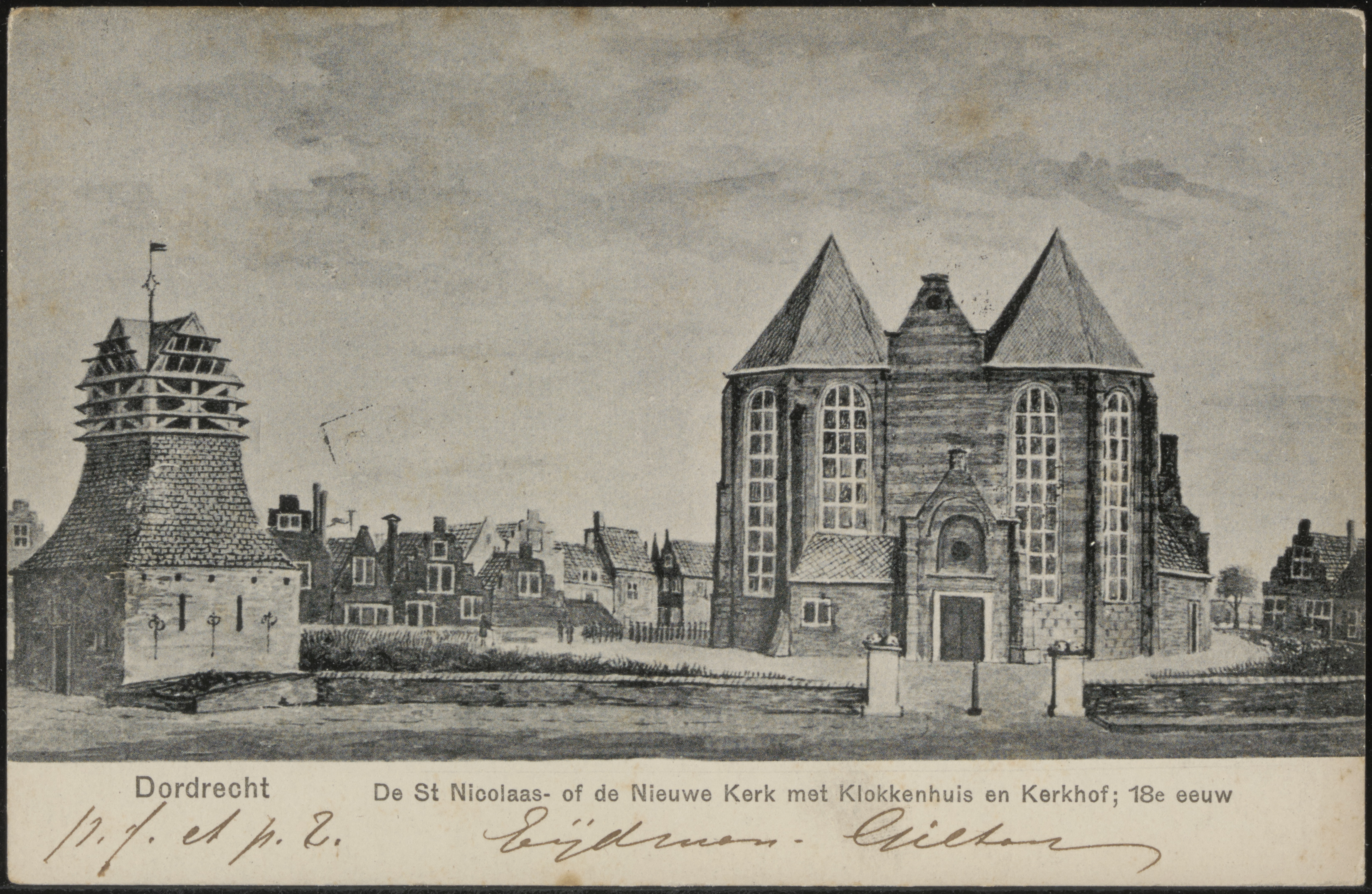 - Tekening van de Nieuwkerk met het klokkenhuis en kerkhof op het Nieuwkerksplein.