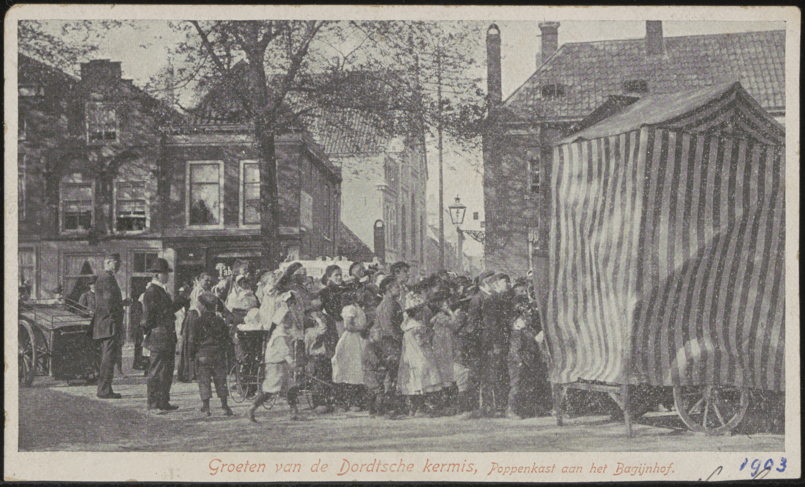 De poppenkast van de kermis opgesteld op het Bagijnhof voor de Spaarbank. Recht voor is …