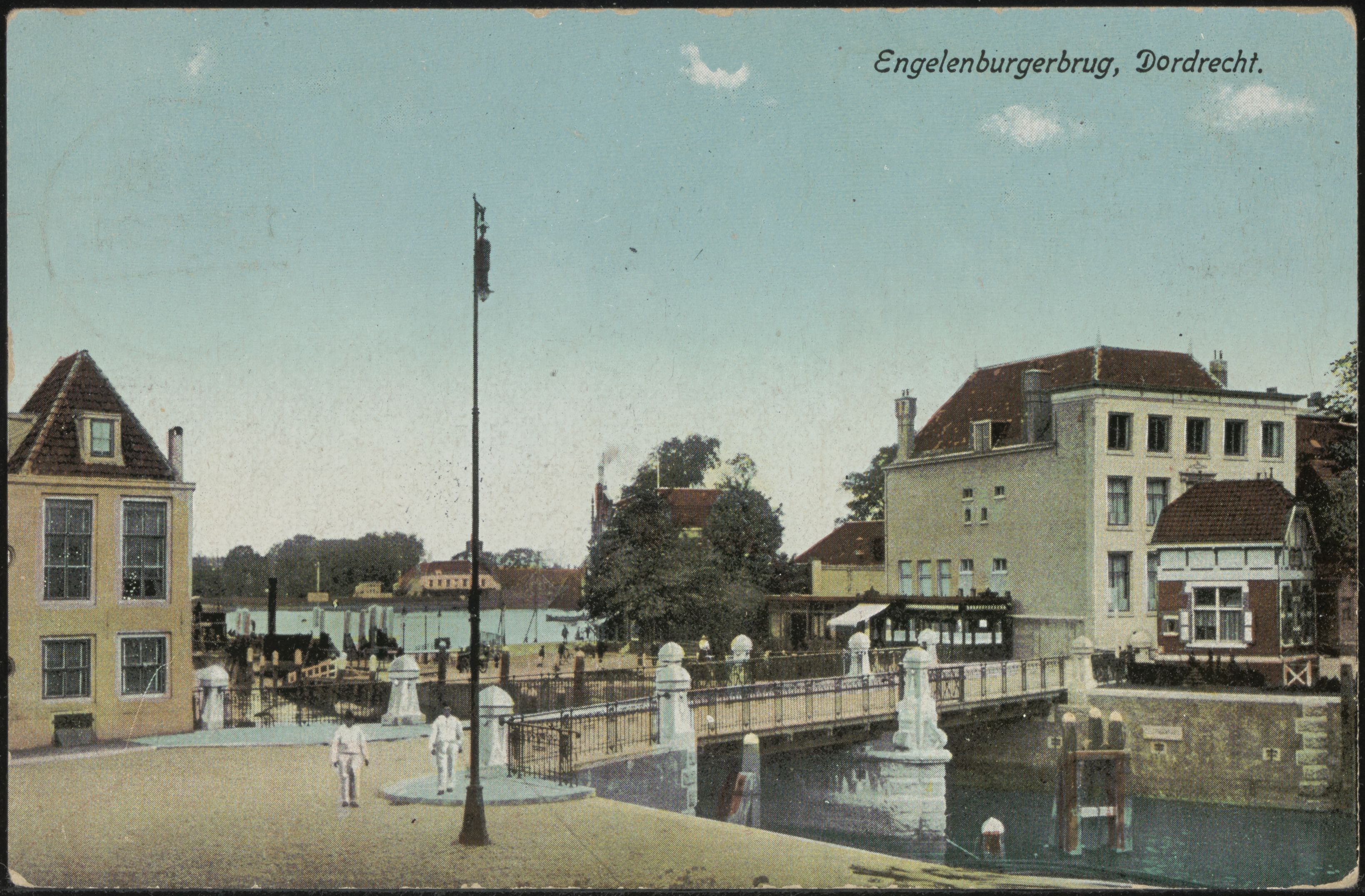 - De Engelenburgerbrug over de Nieuwe Haven in de richting van de Kweekschool met den Bijbel op het Blauwpoortsplein.