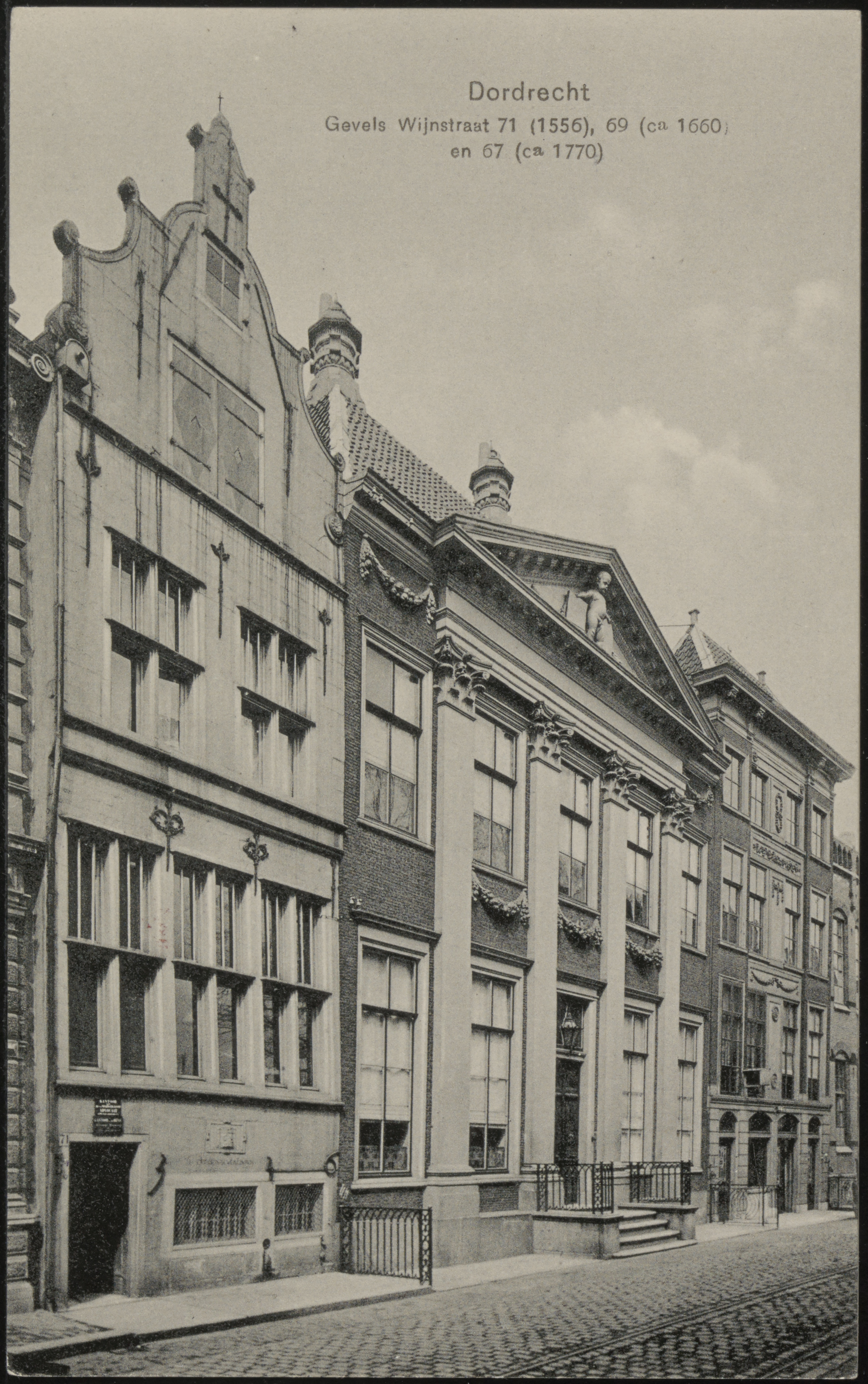 - Links Huis Beverenburch, midden Huis de Onbeschaamde en rechts Huis de Molen in de.Wijnstraat. Rechtsonder de rails van de paardentram.