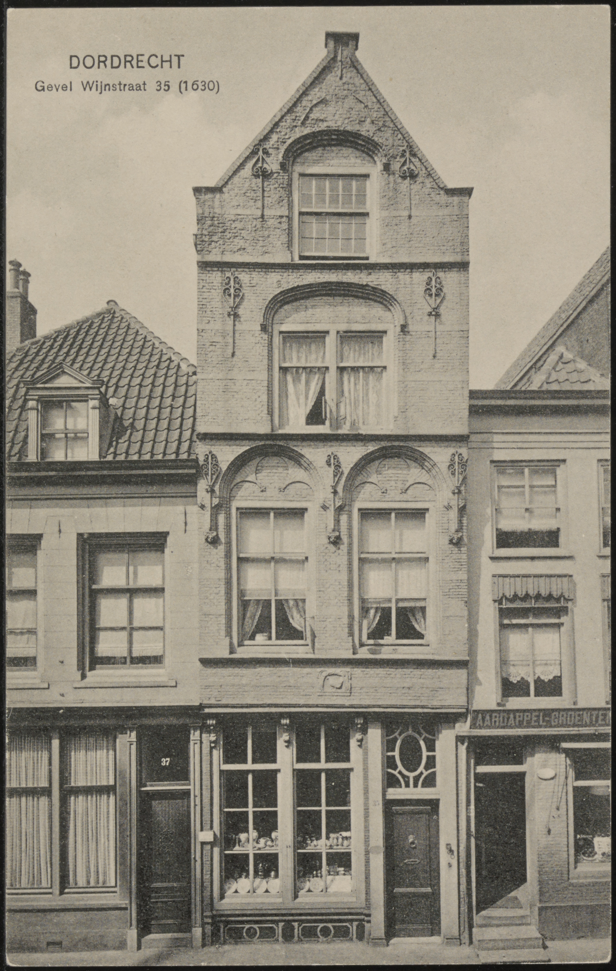 Iets wat we voor enkele jaren terug daadwerkelijk zagen gebeuren hier op de beeldbank bij nogal wat afbeeldingen. Maar dit betreft natuurlijk een ander pand en wat ook is opgenomen in het boekje "Oude gebouwen te Dordrecht" onder nummer 120 met de navolgende tekst: "120. 1630. Wijnstraat 35. Topgevel met banden. Dordtsch type met toogvulling van Klaverblad en Lelie, 2e en 3e verdieping met termijntogen, 3 cordonbanden, waarvan de onderste versierd, 3 kopjes als draagsteenen, 7 ankers in 3 dessins. Gevelsteen en cartouche met de afbeelding van een hen en het opschrift: In De Hen An. 1630" Zie ook 552_701741, 552_408028, 551_70180, 551_30229 en 552_303146.