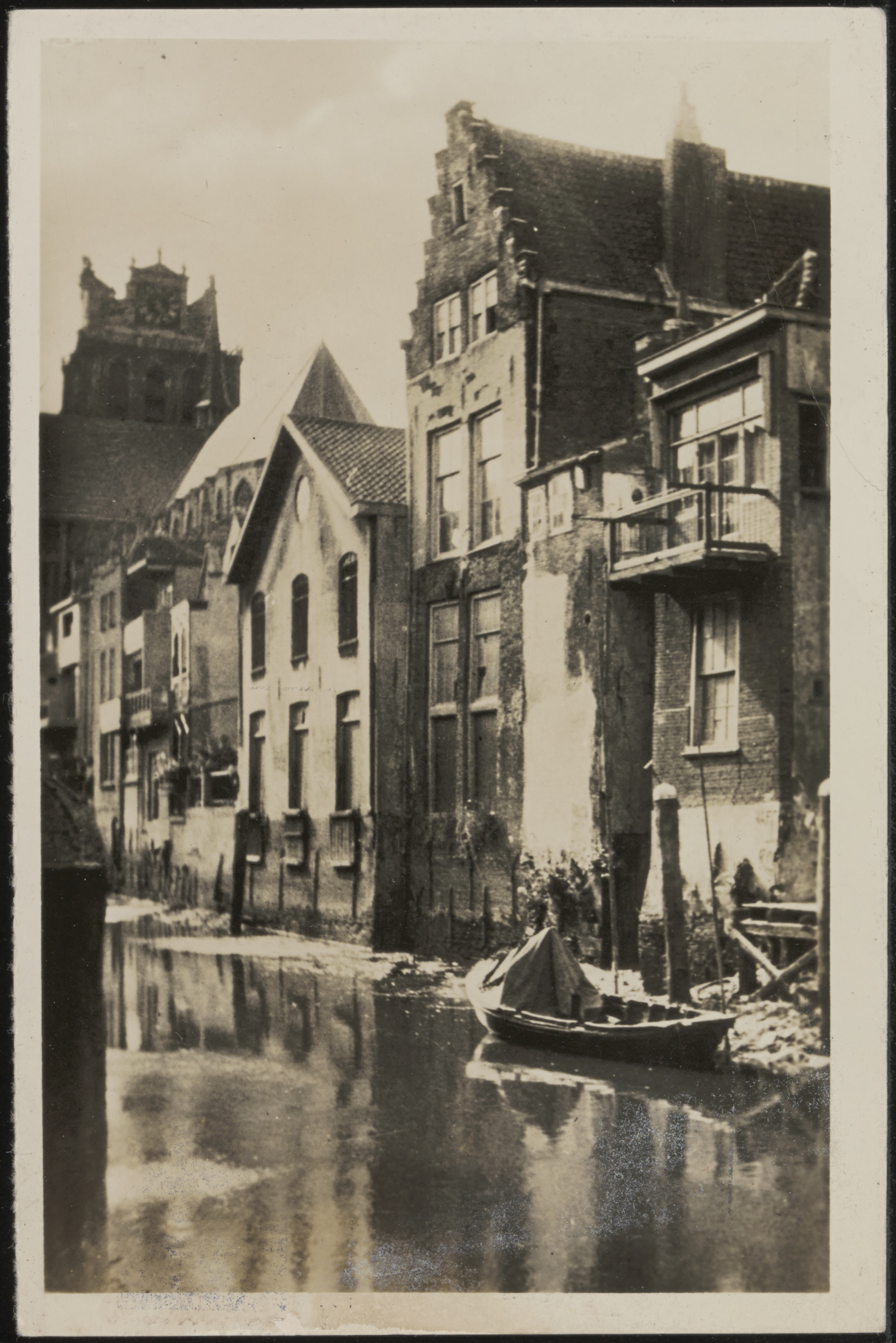 Voorstraatshaven gezien vanaf de Botgenssteiger richting Grote Kerk. Bij de roeiboot is …