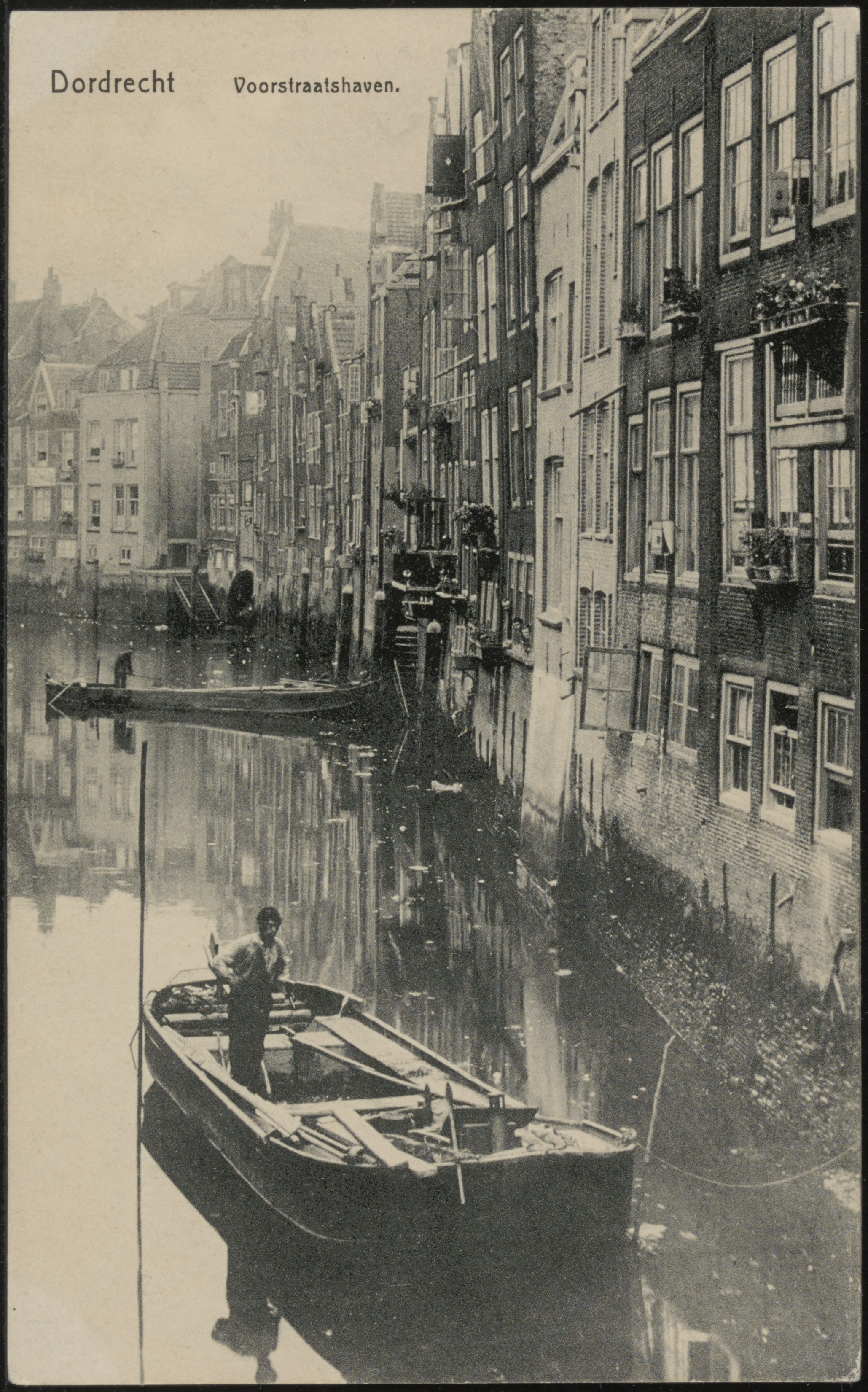 - De Voorstraatshaven vanaf de Pelserbrug naar het oosten. Huizen staan aan de Voorstraat.