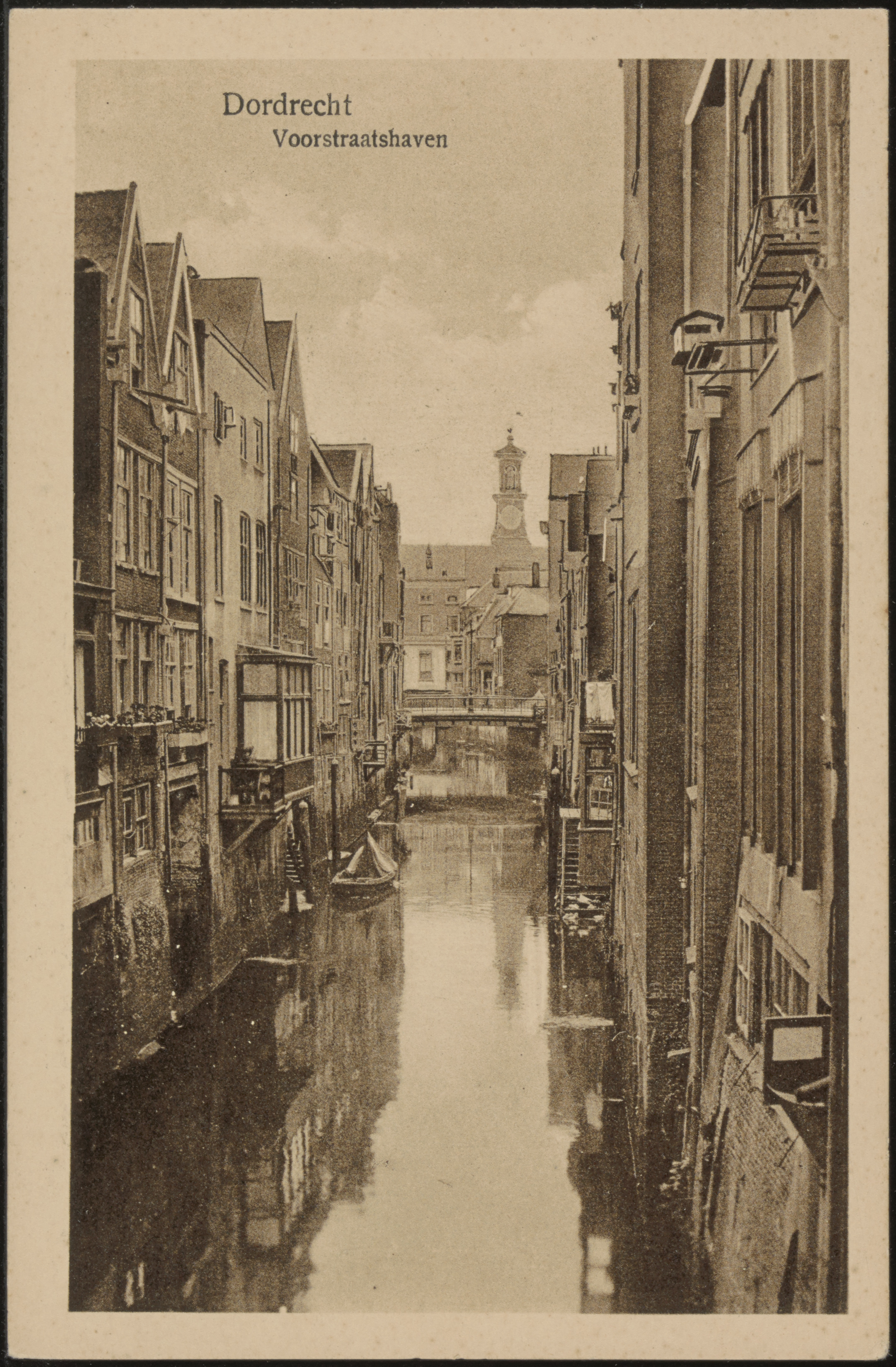 - Voorstraatshaven vanaf de Tolbrug over de vernieuwde Visbrug naar het stadhuis. Links de Voorstraat, rechts de Groenmarkt.