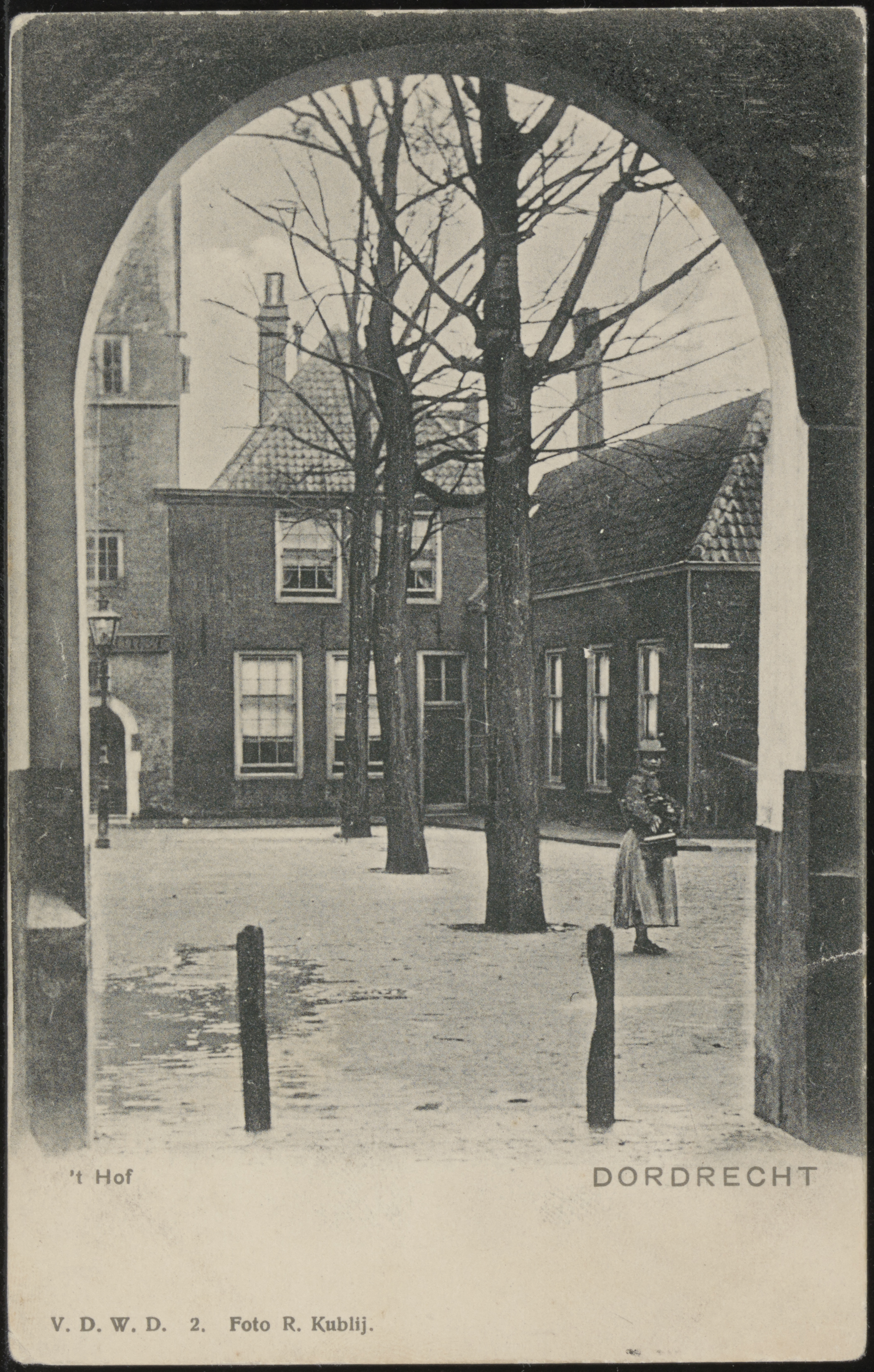 - De noordoosthoek van het Hof, gezien door het poortje vanaf de Voorstraat. Geheel links het gebouw van Vak en Kunst.