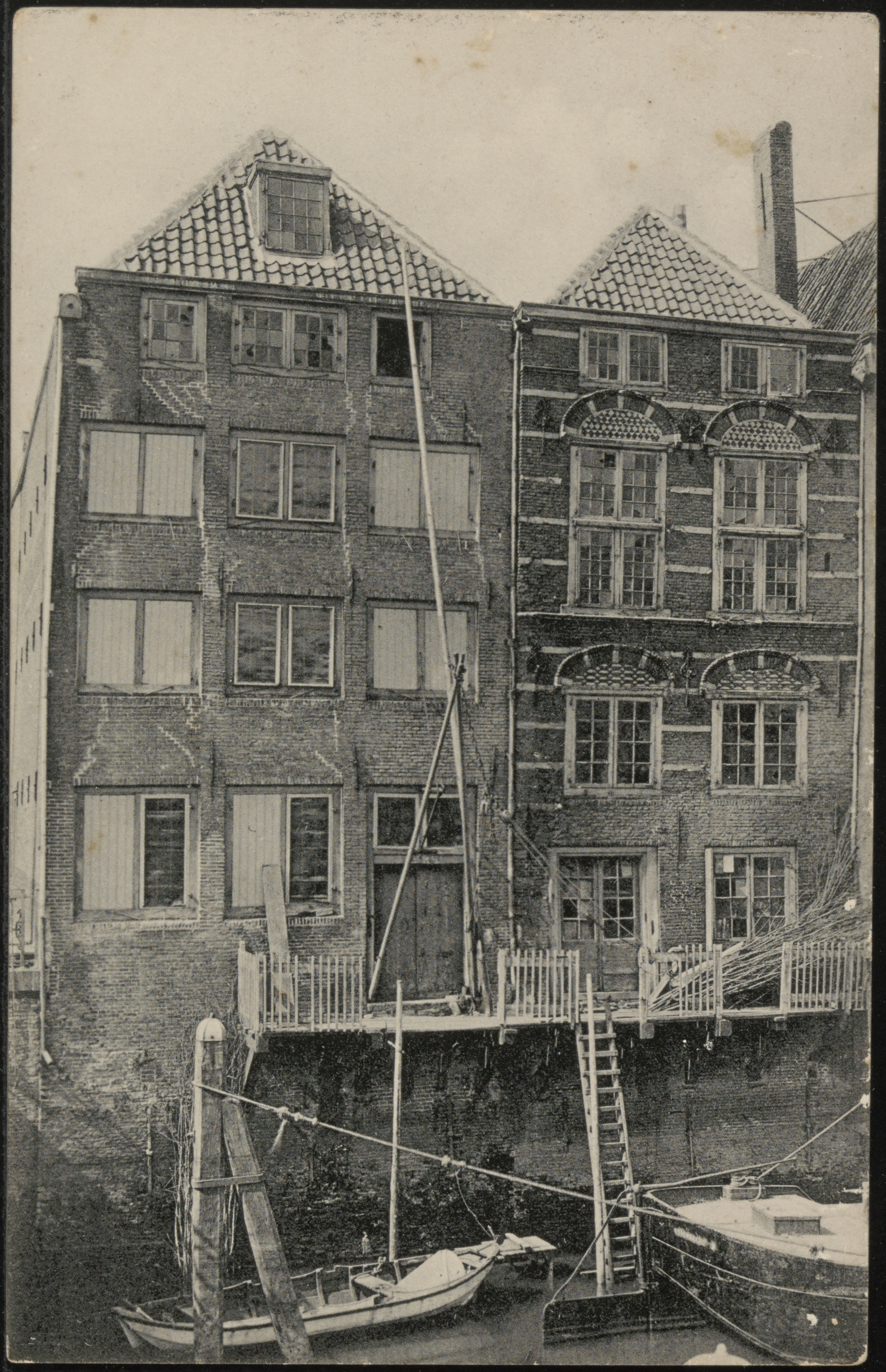 Achterkant van panden aan de Wijnstraat, gezien vanaf de Nieuwbrug over de Wijnhaven. …