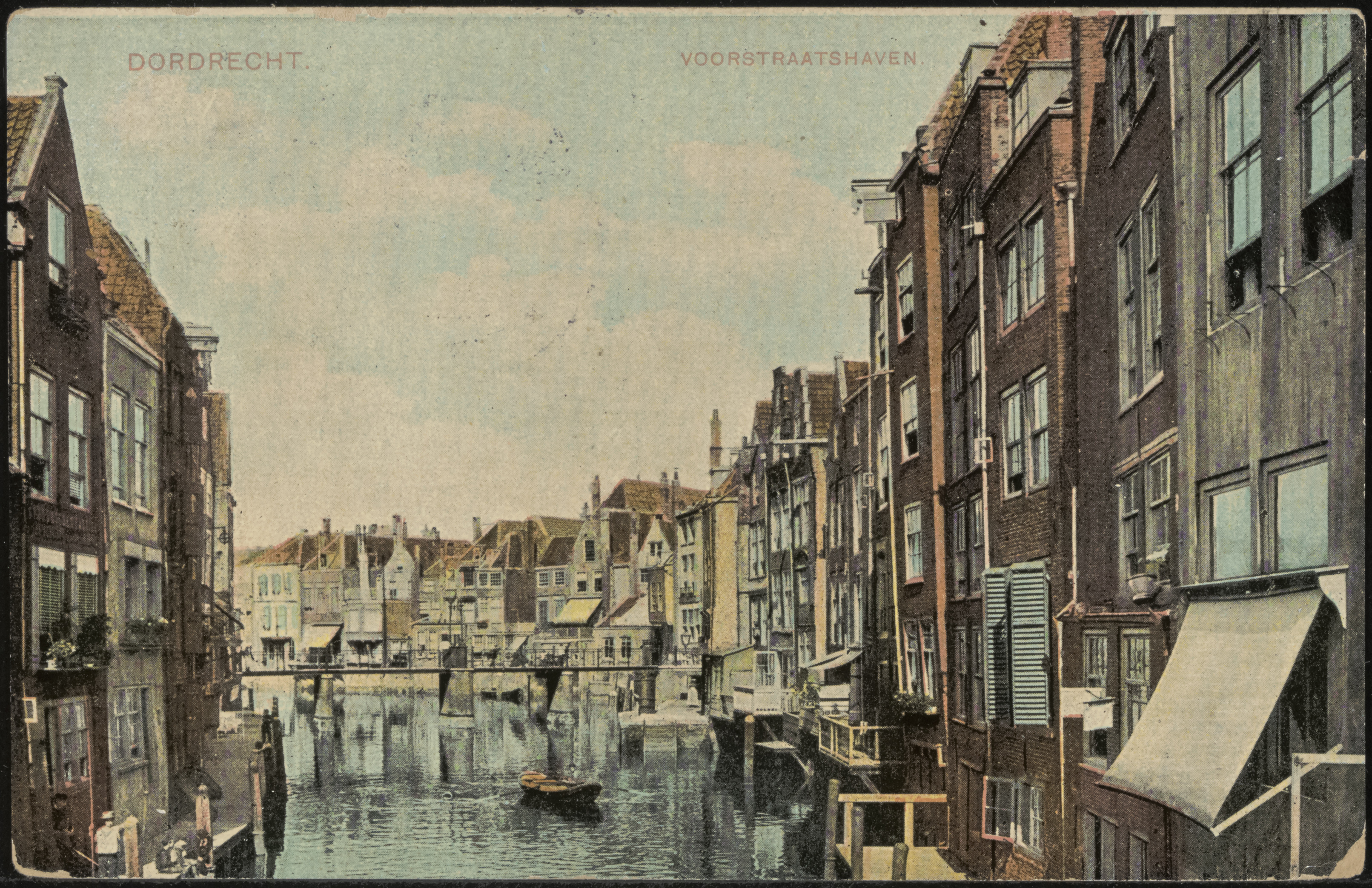 - De Wijnhaven vanaf het Scheffersplein richting Wijnbrug. Links de Wijnstraat, rechts de Voorstraat.
