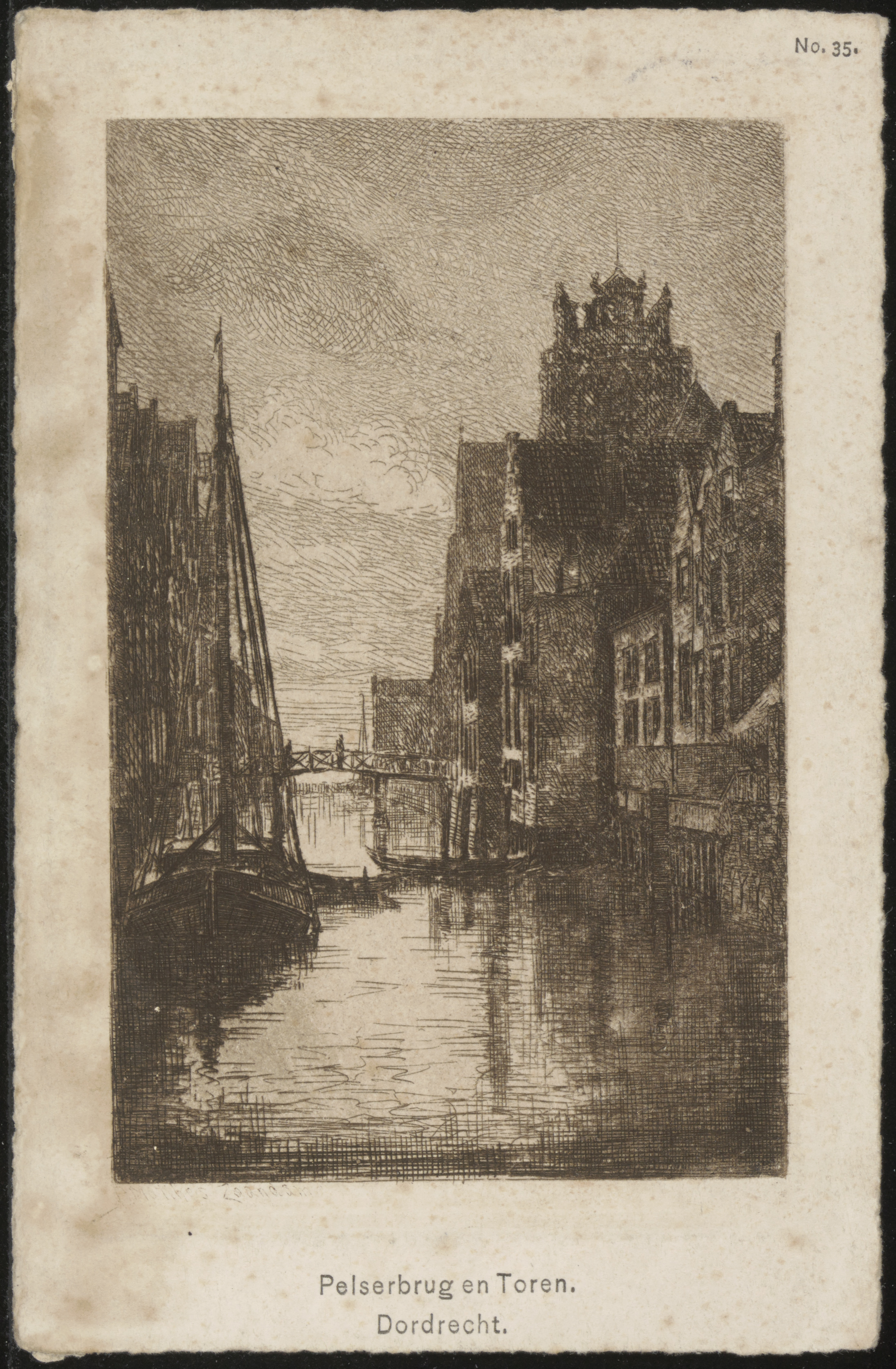 - Tekening door P. Matthes van de Voorstraatshaven, gezien richting Pelserbrug en Grote Kerk. Links de Voorstraat, rechts de Grotekerksbuurt.