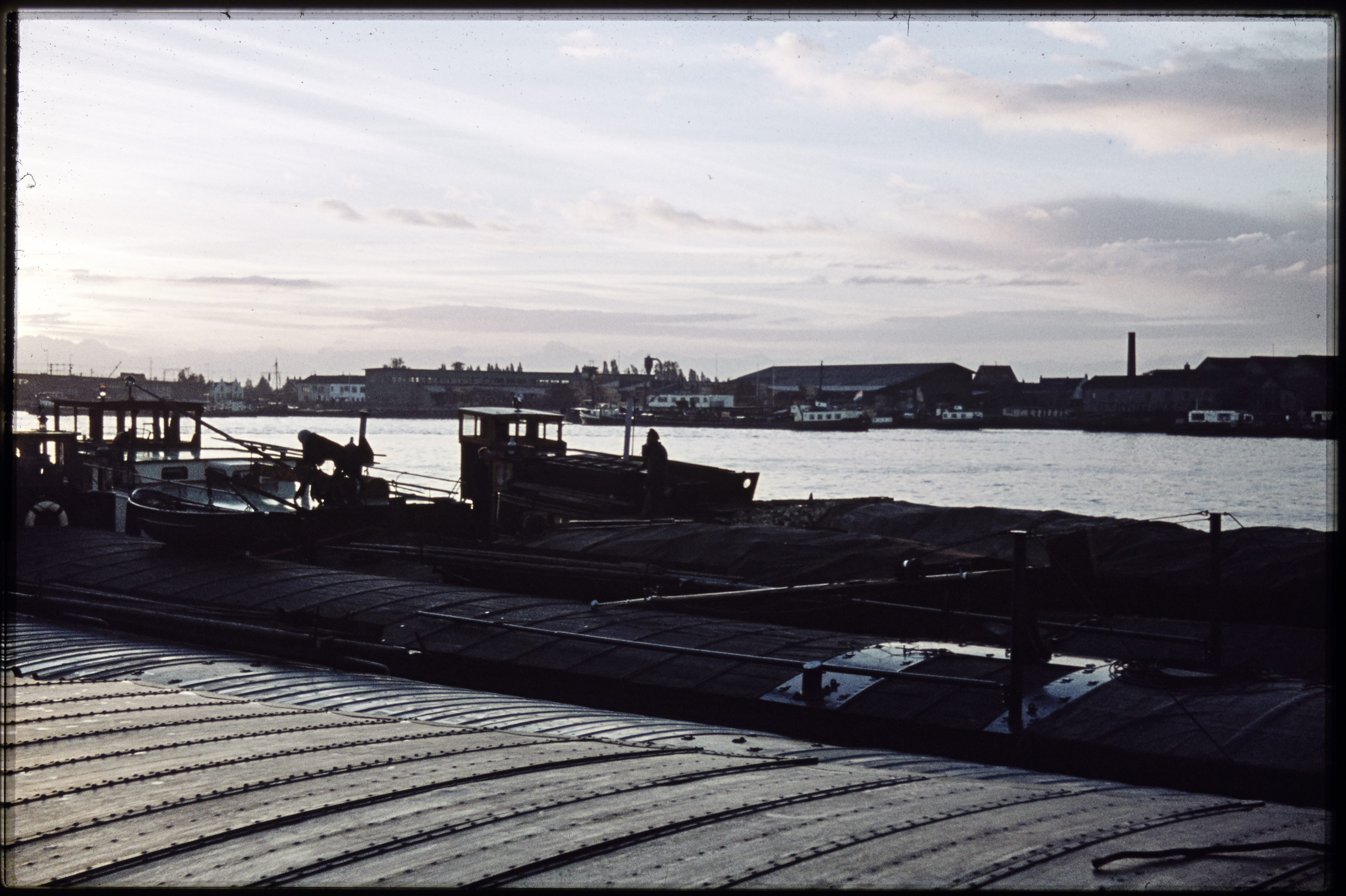 Aan de Dordtse oever afgemeerde rijnaken in de Oude Maas.