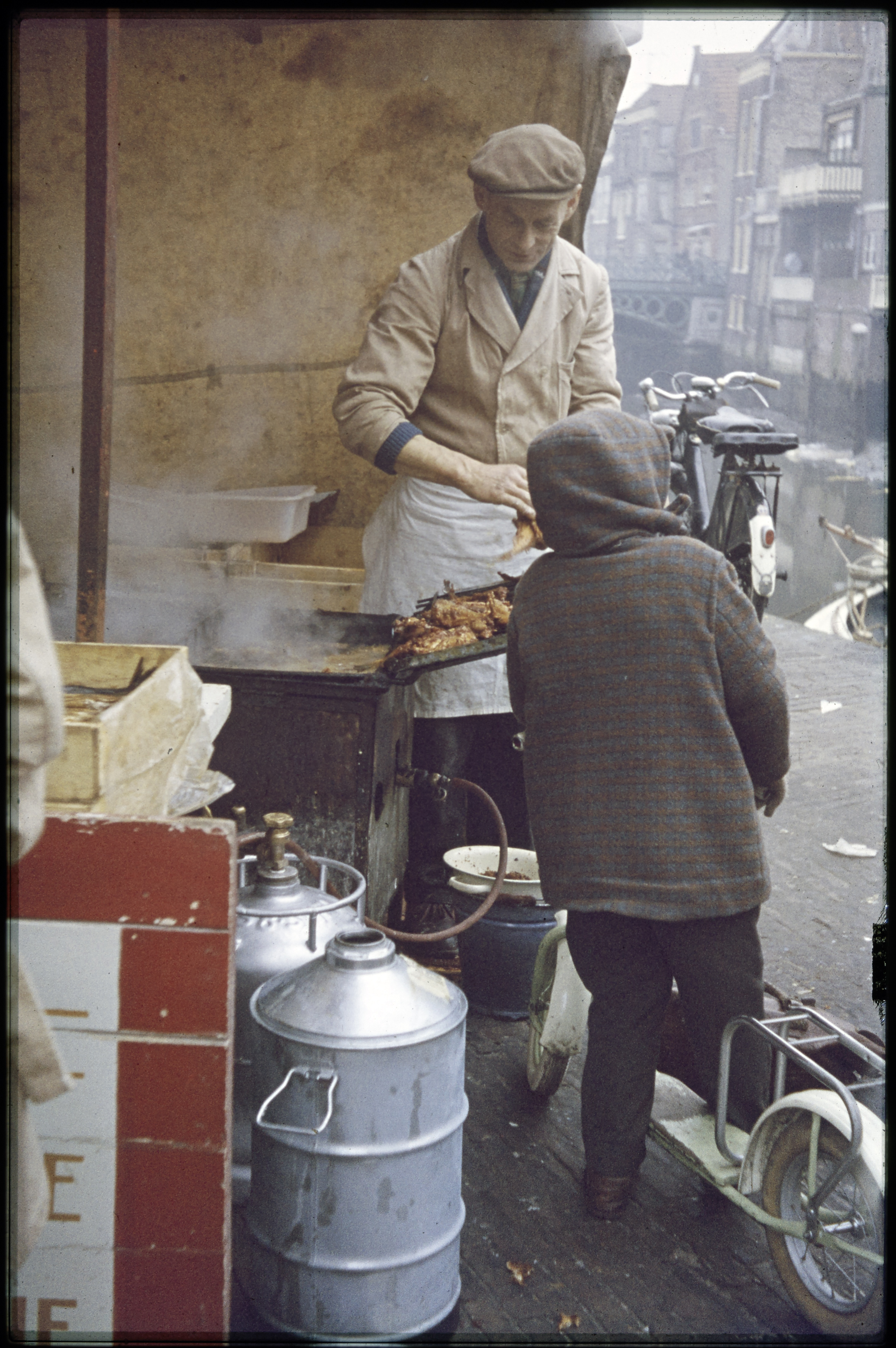 - Vismarkt op de Botermarkt. Rechts de Voorstraatshaven en huizen in de Voorstraat.