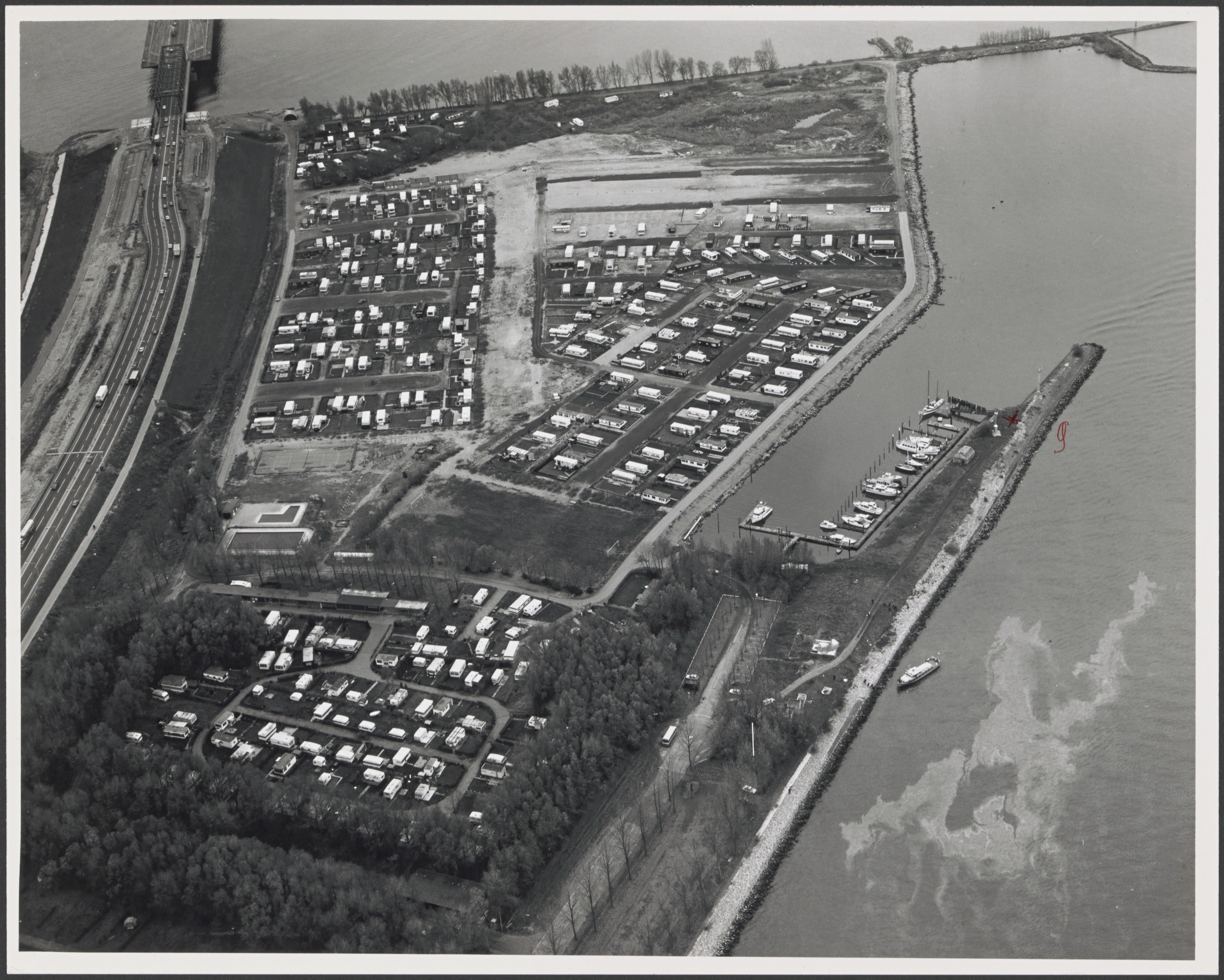 - Luchtfoto van camping Bruggehof in Willemsdorp. De Moerdijk wordt verbreed (links boven).