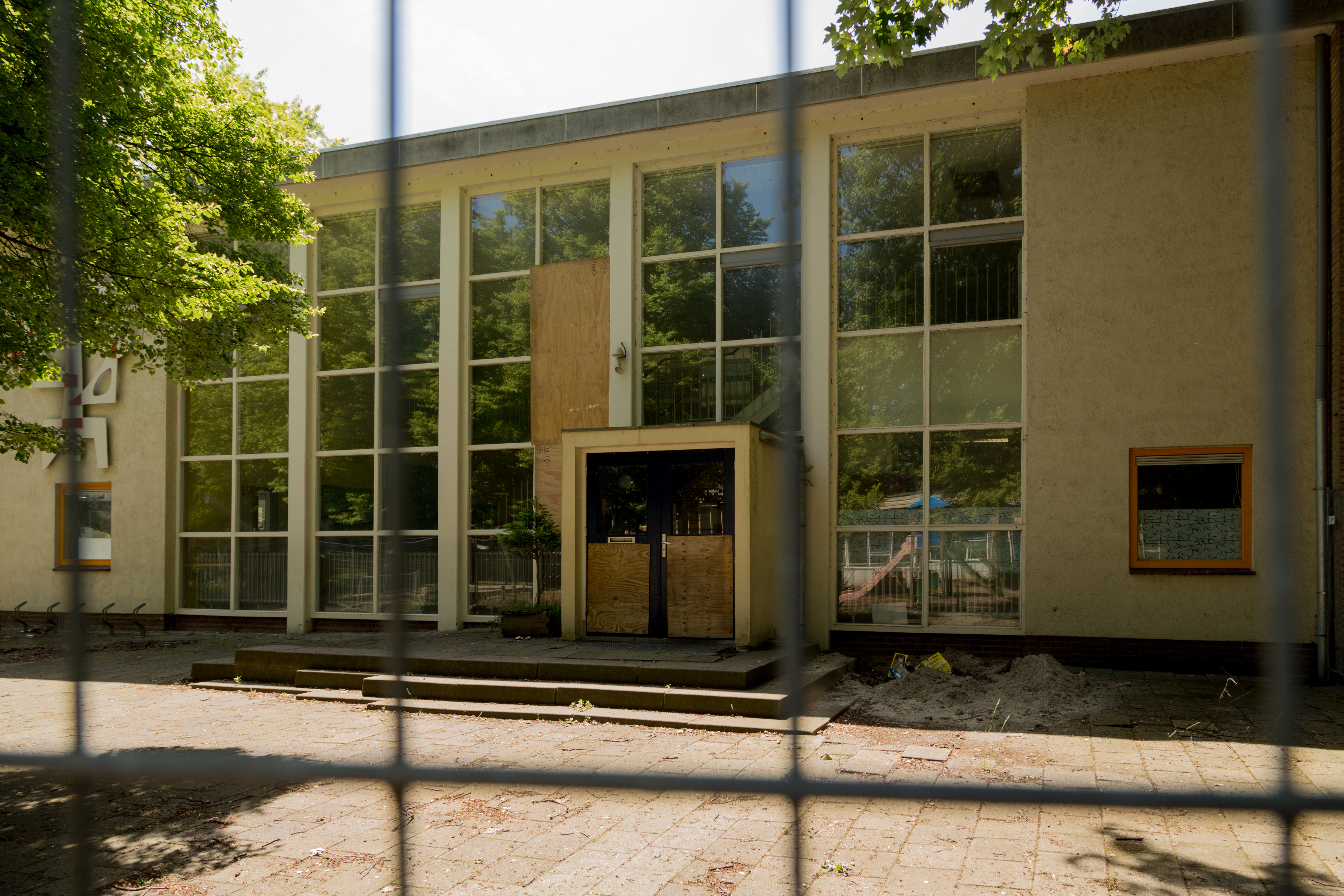- Ingang op de noordvleugel van de Montessorischool aan de Troelstraweg.