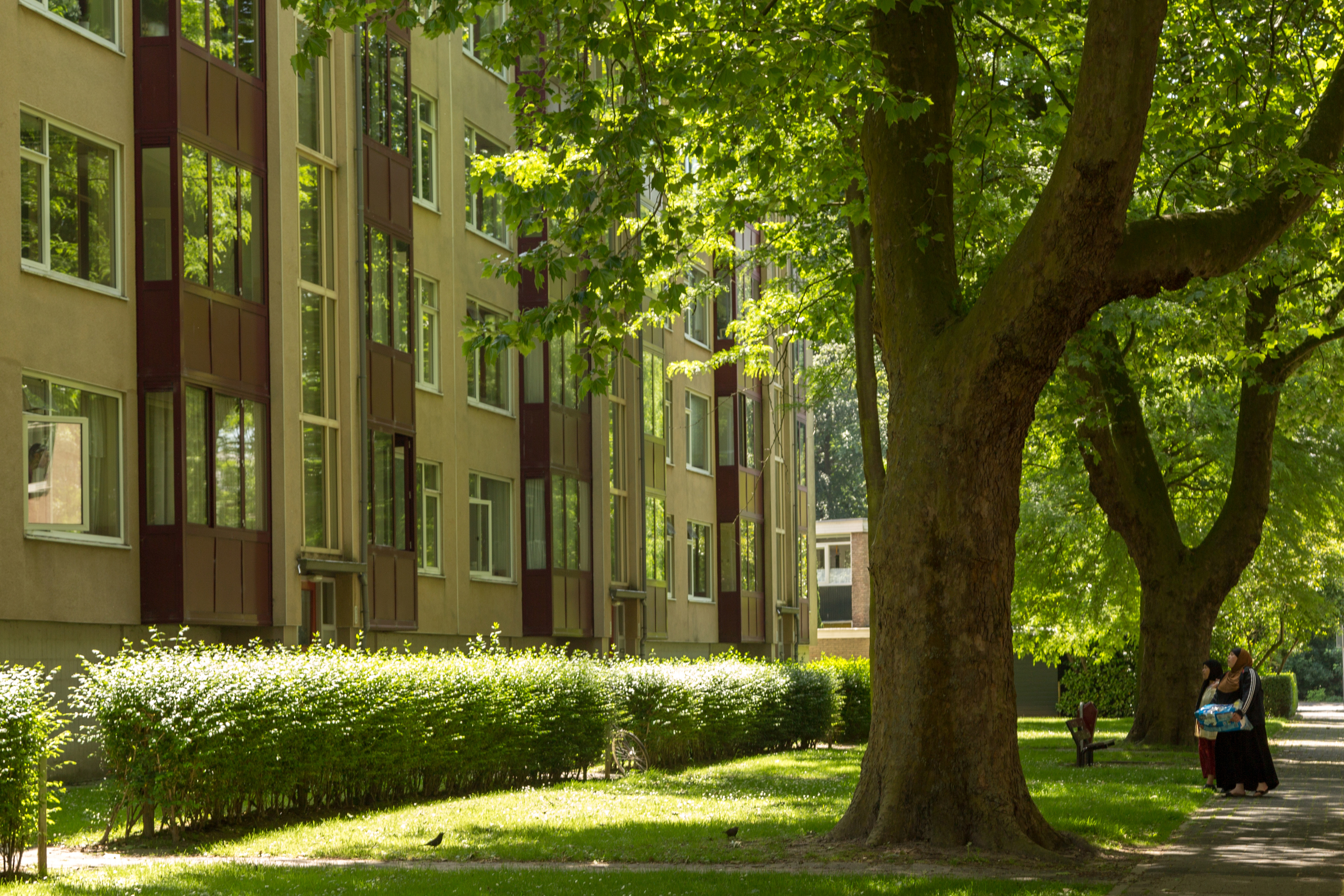 - flatgebouwen voetgangers zitbanken