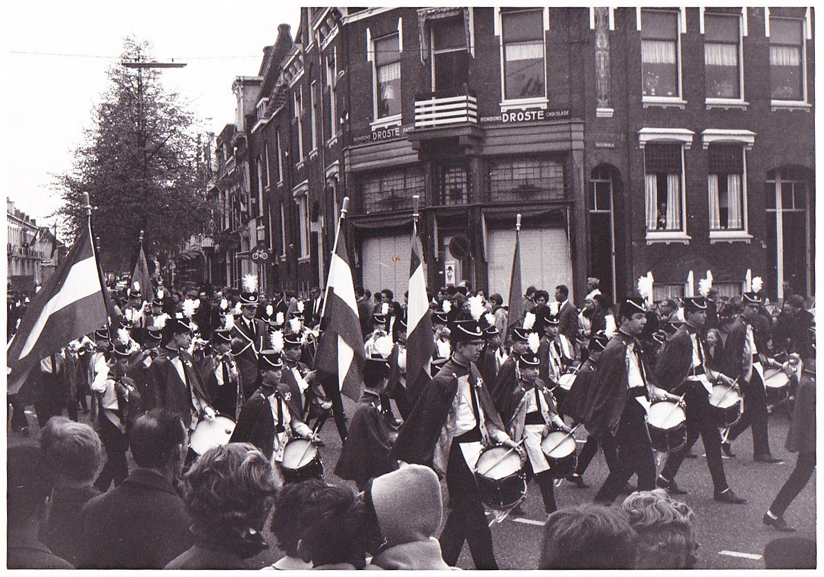 - Muziekkorps op de hoek Nicolaas Maessingel - Blekersdijk (rechts).
