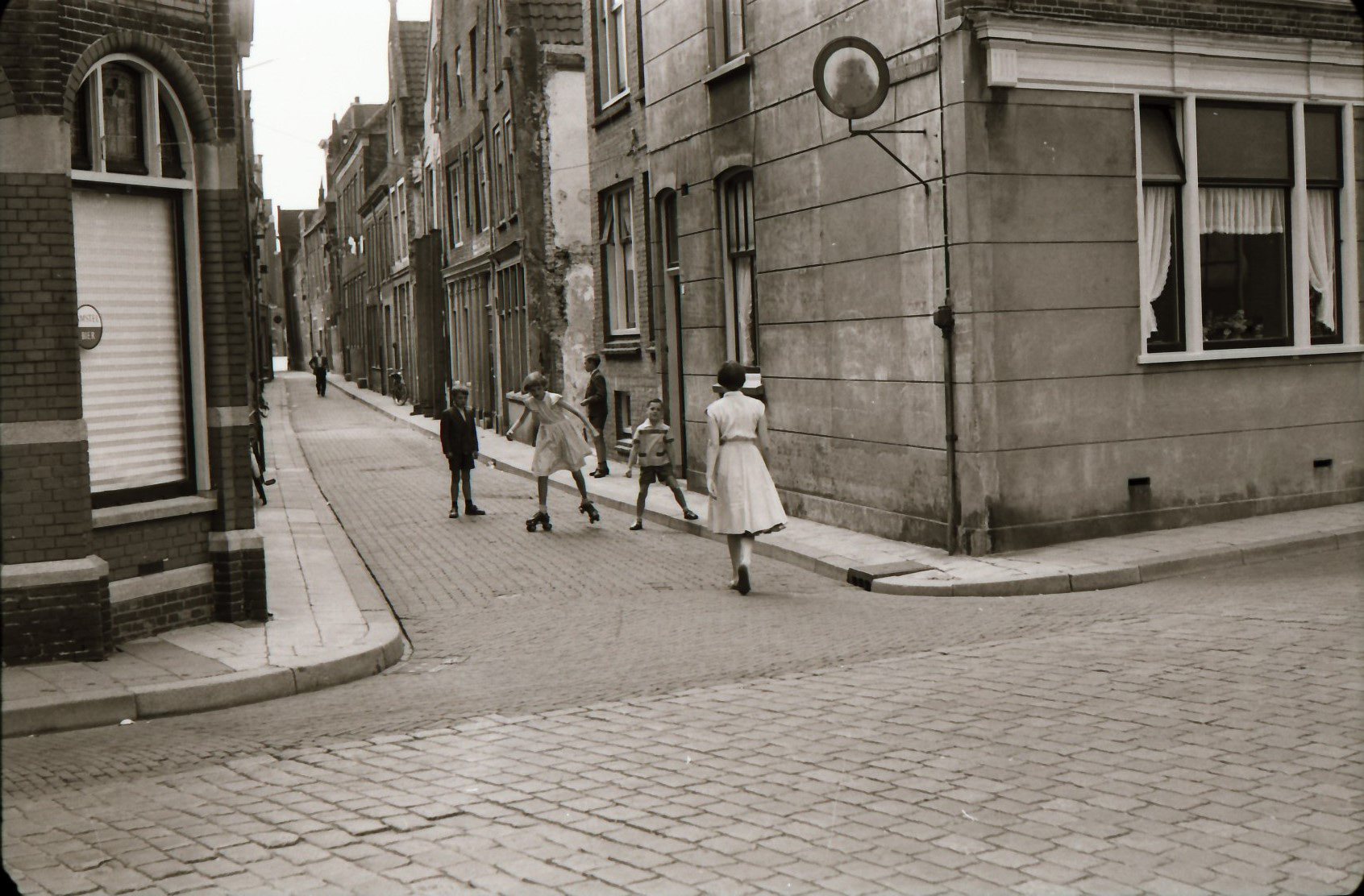 - Spelende kinderen in de Tolbrugstraat Waterzijde gezien vanaf de Varkenmarkt.