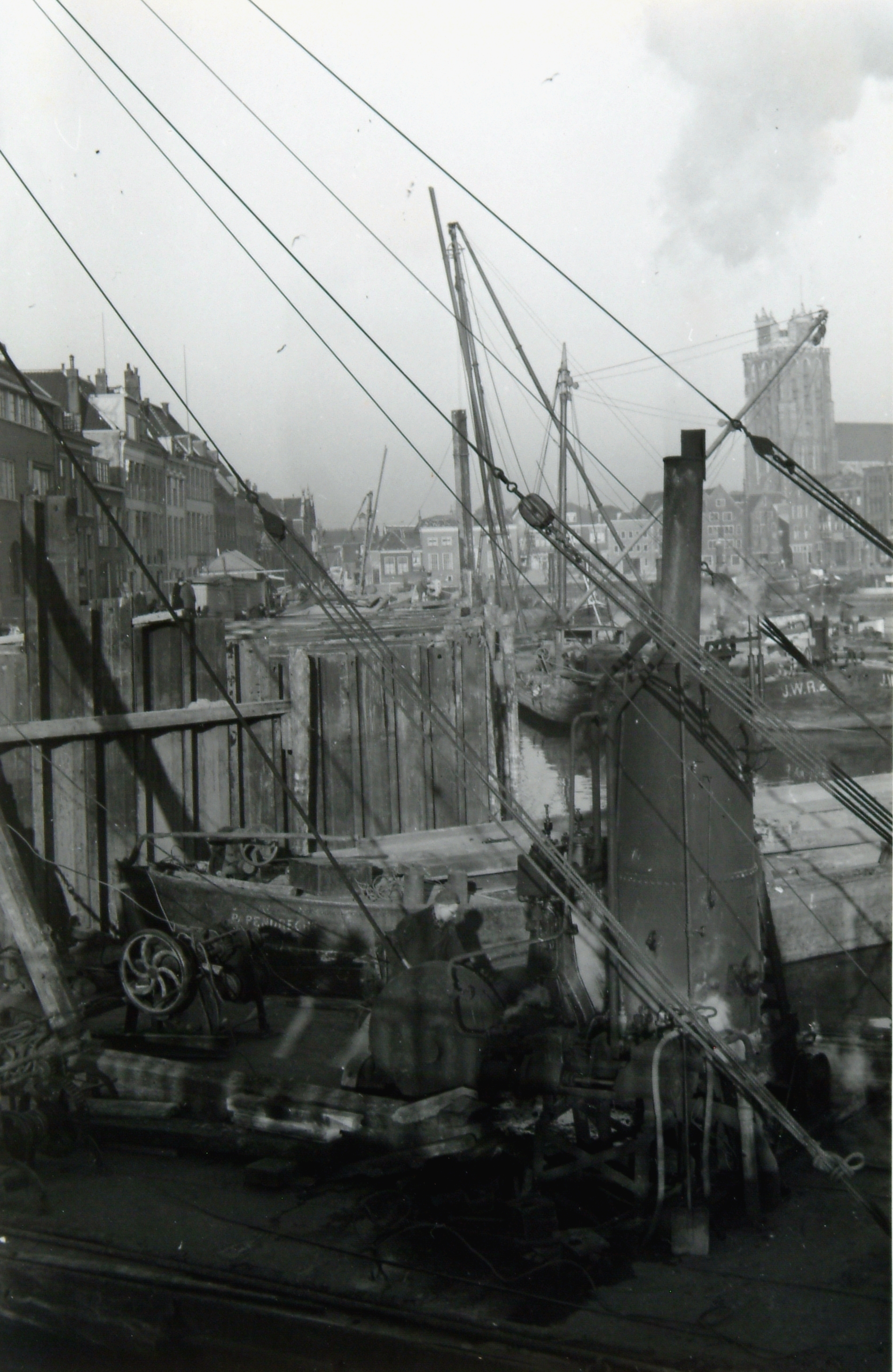 - Bouwwerkzaamheden om de kade van de Binnen Kalkhaven te verbreden. In de voorgrond een door stoom aangedreven kraan, daarachter zijn damwanden te zien.