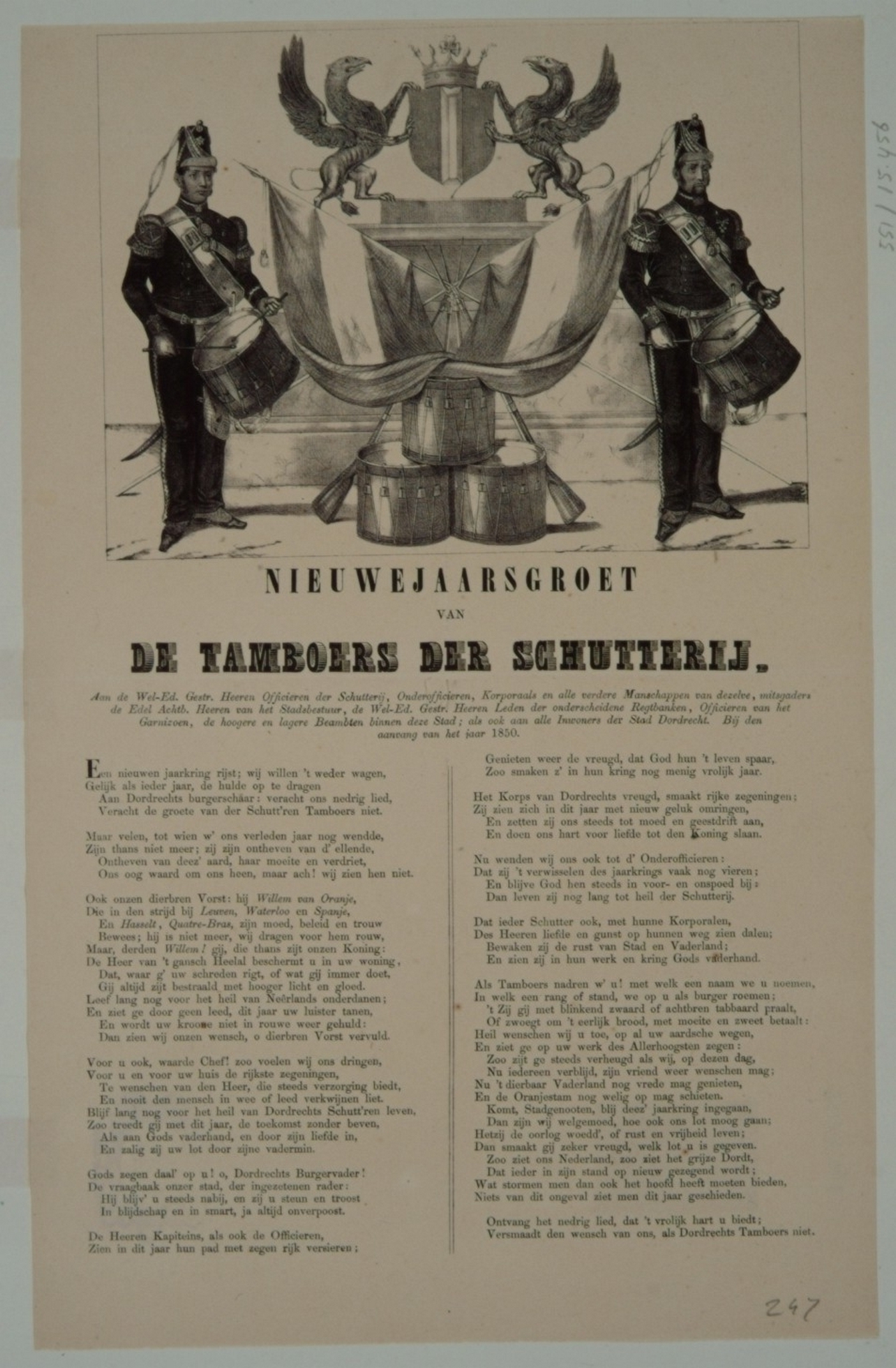 - Nieuwjaarswens van de tamboers der Schutterij voor het jaar 1850; vers in twee kolommen met daarboven het stadswapen en een trofee van trommen en vaandels, geflankeerd door twee tamboers in de nieuwe uniformen uit 1846.