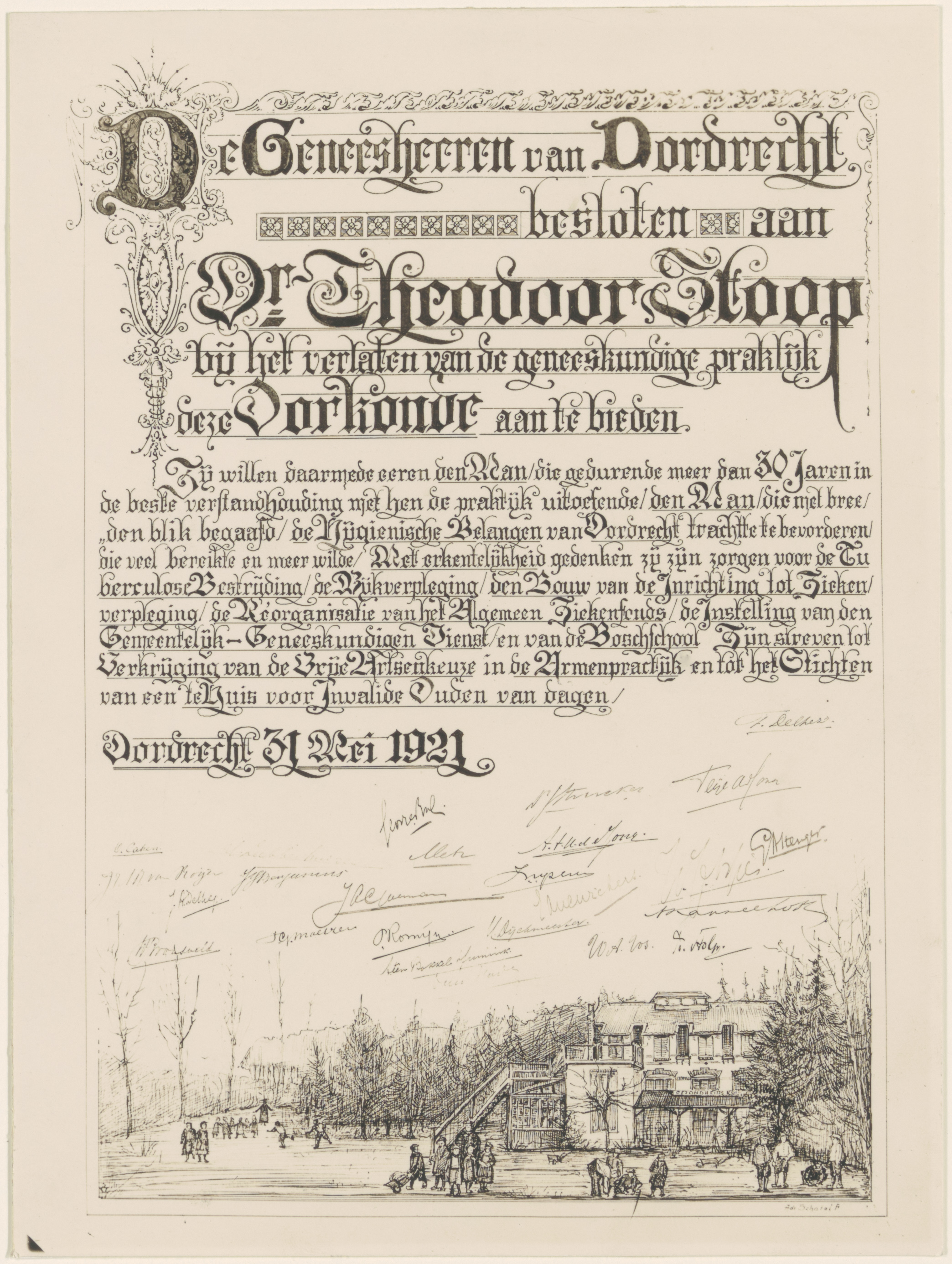 - Huldigingsoorkonde van de Dordtse Geneesheren voor Dr. Theodoor Stoop bij het neerleggen van zijn praktijk.