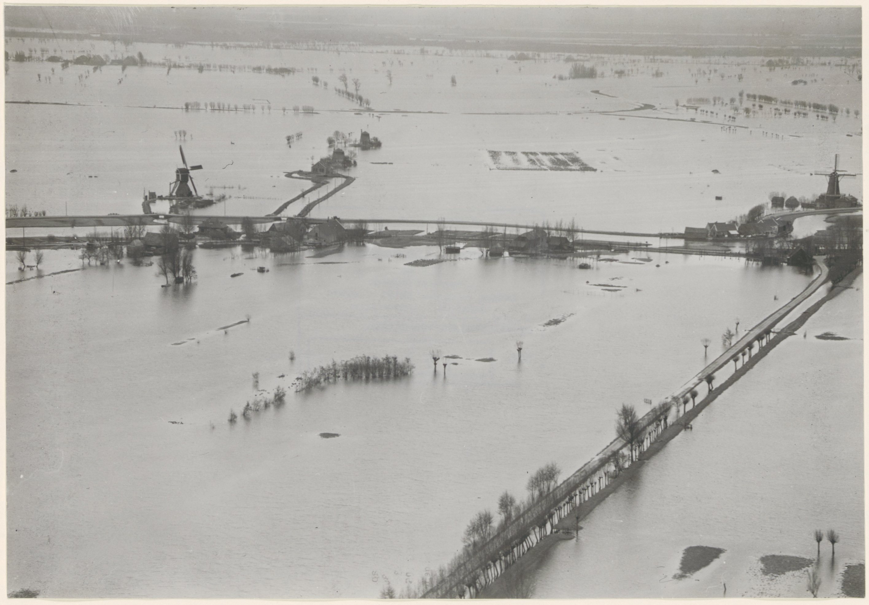 - Overstroming tijdens de watersnood in Bleskensgraaf. Links de Wingerdse Molen, rechts korenmolen De Hoop.