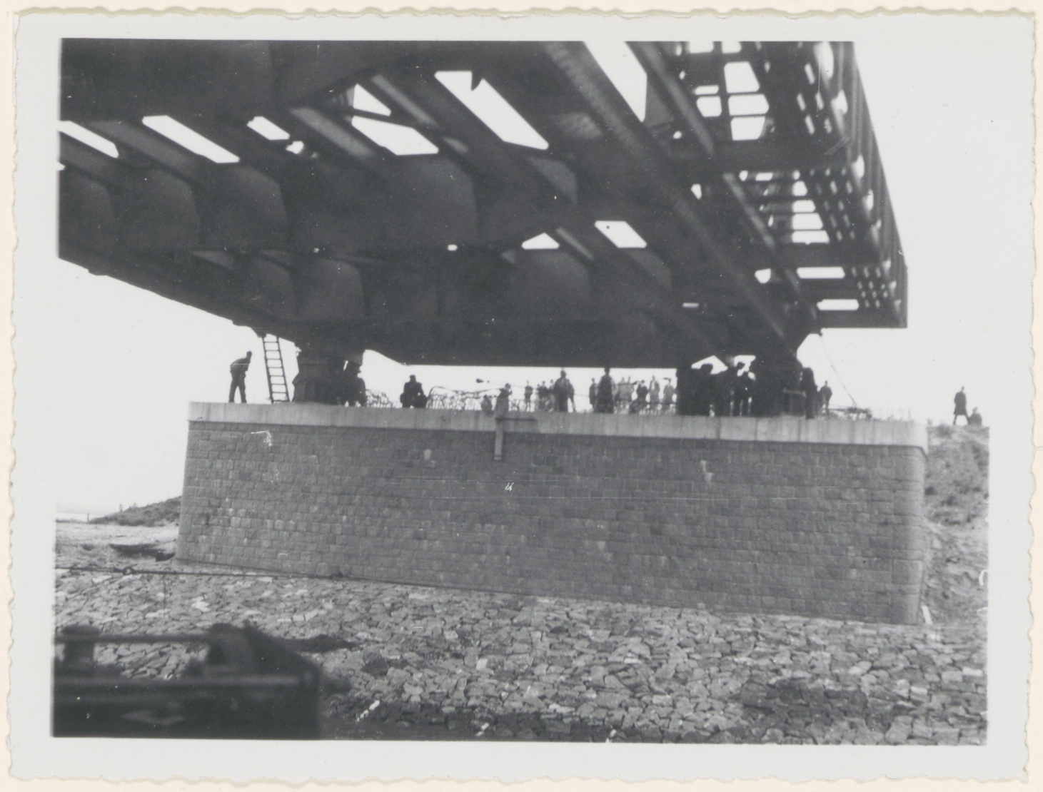 Invaren van een overspanning naar een landhoofd. Zie ook 552_320535, noordelijk landhoofd, en 552_310526, zuidelijk landhoofd. De derde overspanning is ingevaren naar het zuidelijke landhoofd aan Brabantse kant. De tiende en laatste overspanning is ingevaren naar het noordelijke landhoofd aan Dordtse kant. Dit lijkt mij het noordelijke landhoofd met het hoge dijklichaam. Het invaren van de tiende en laatste overspanning vond plaats op 17 juli 1936.