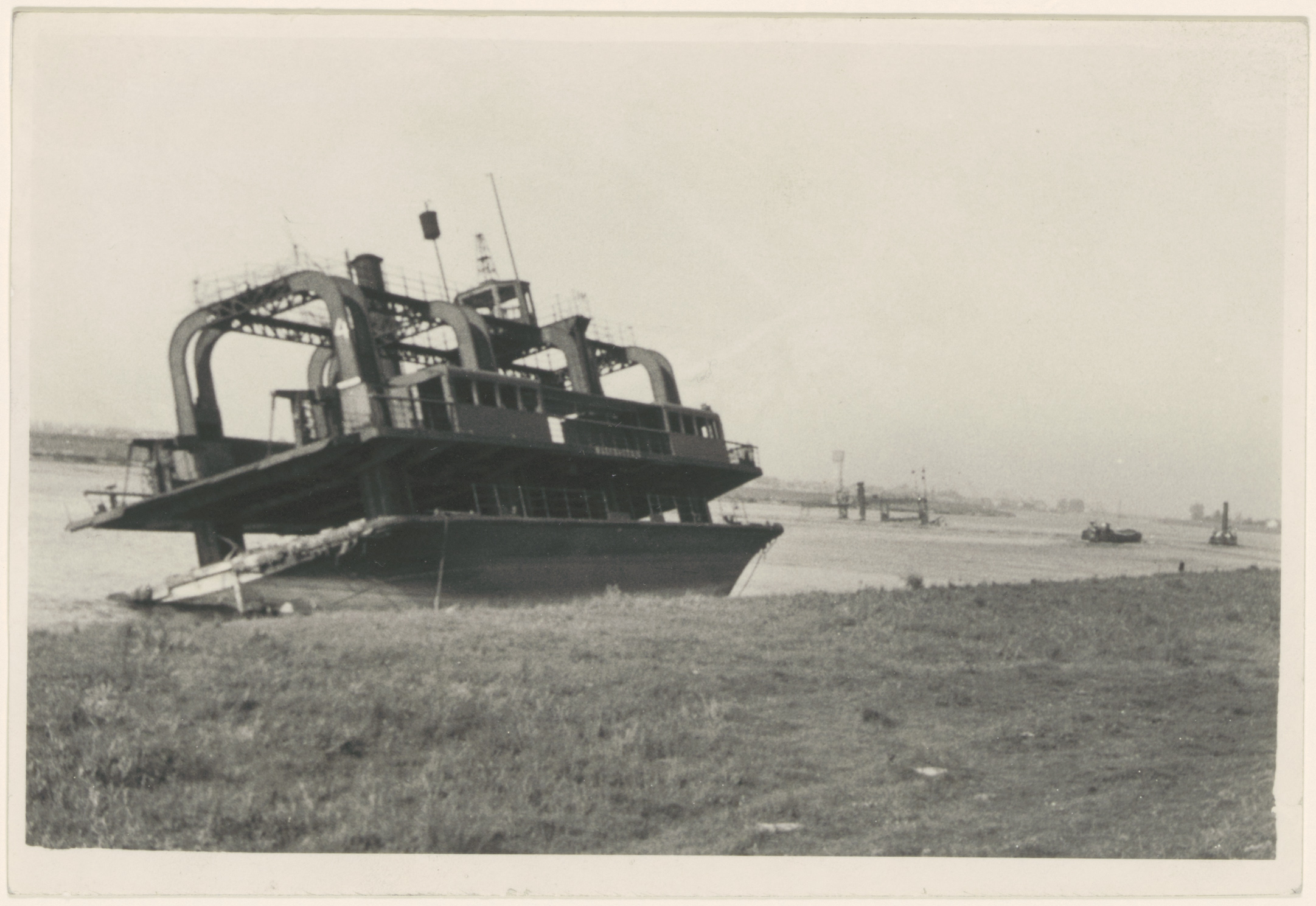 - Door de Duitsers vernielde veerboot voor auto's in de Dordtsche Kil om een eventuele geallieerde opmars te bemoeilijken.