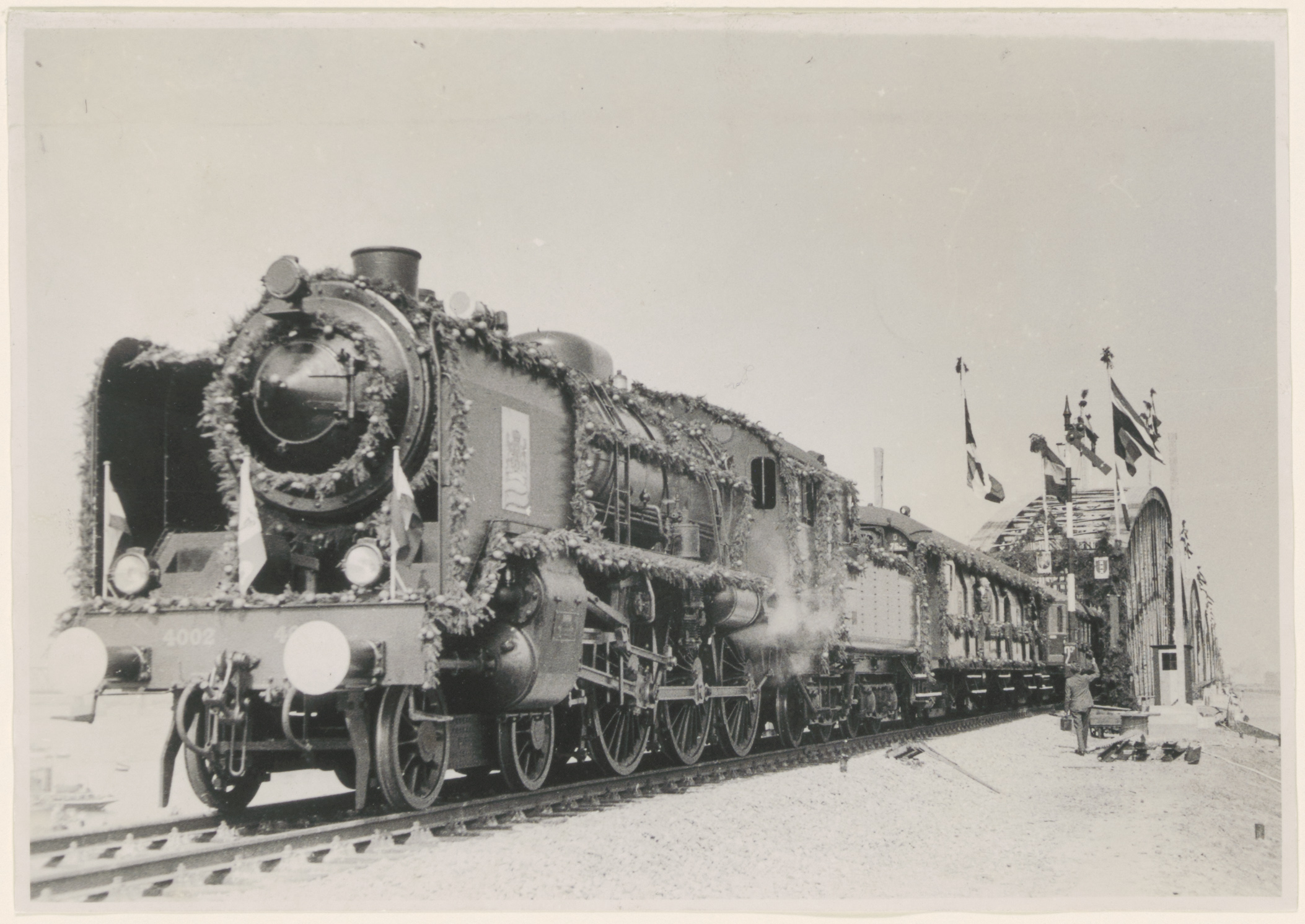 - De feesttrein verlaat de van oorlogsschade herstelde spoorbrug over het Hollandsch Diep aan de Brabantse oever.