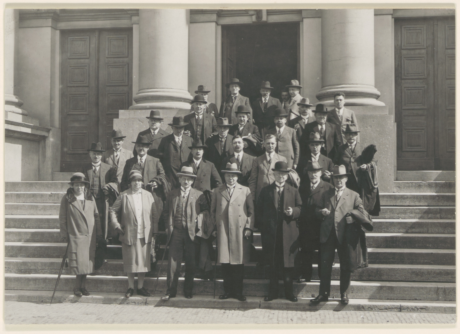 - Groep bezoekers aan de inpolderingswerkzaamheden Biesboschpolder op de trap van het stadhuis.