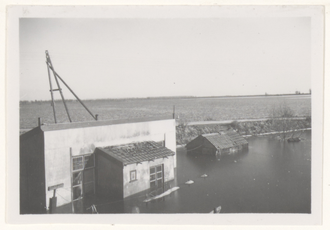 Ondergelopen bebouwing aan de Wieldrechtse Zeedijk ten zuidwesten van de spoorwegovergang tijdens de watersnood.