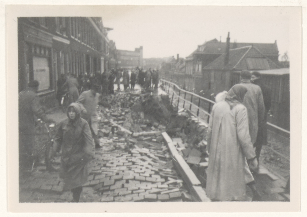 Door de watersnood beschadigde Noordendijk ter hoogte van de Fortuinhof, naar het …