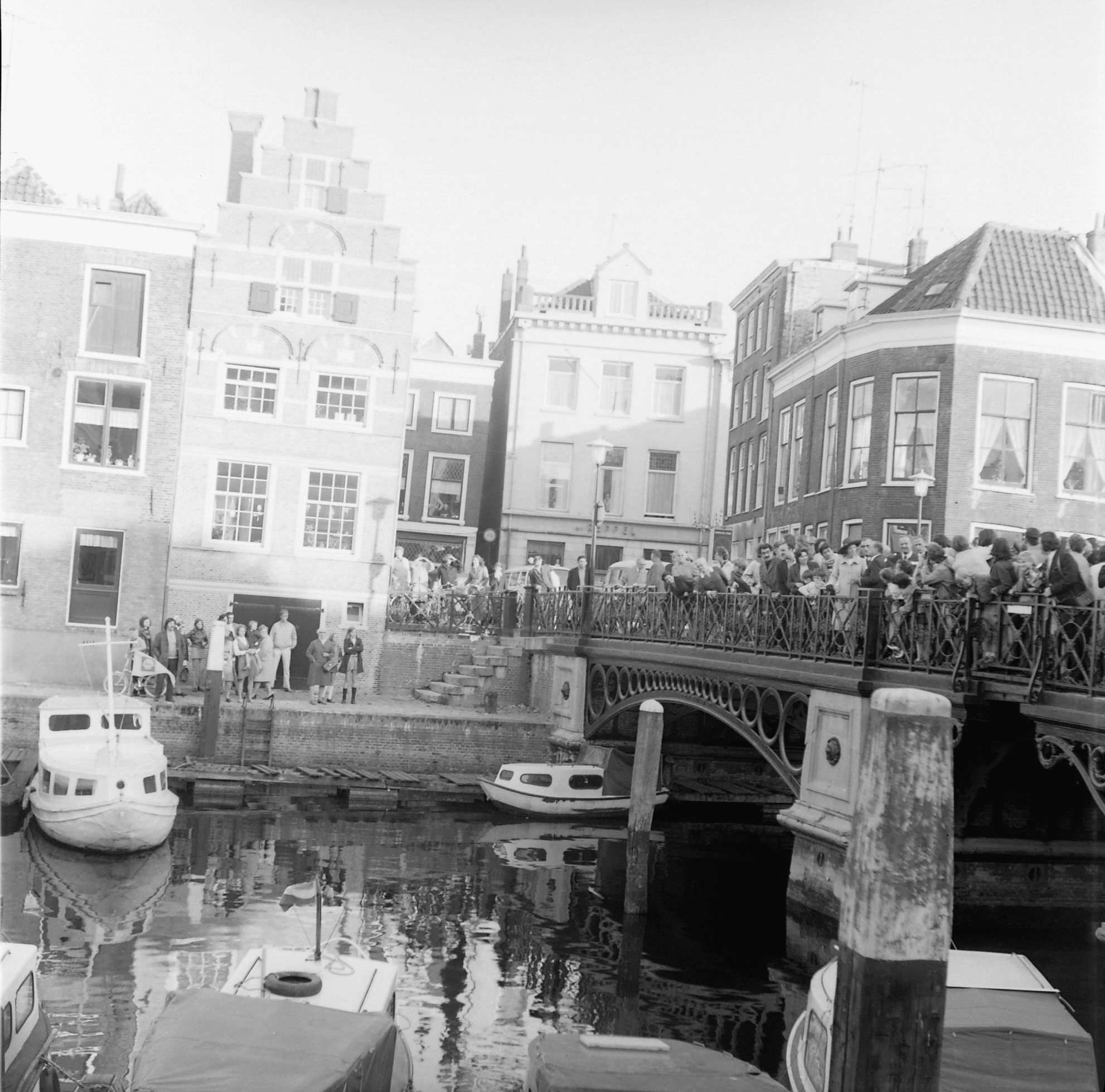 Wachtende mensen voor de komst van Prinses Beatrix en Prins Claus op de Nieuwbrug.
