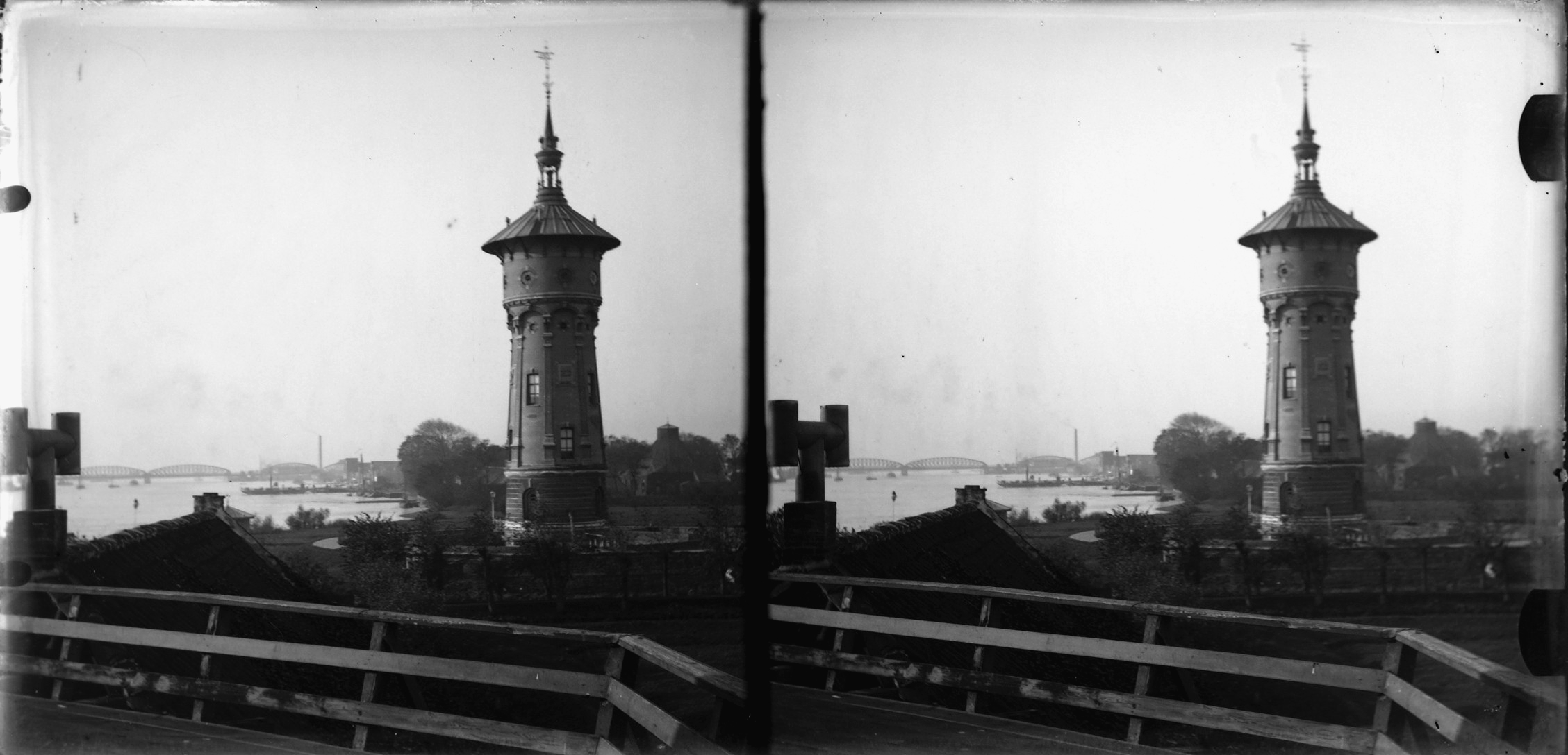 - Stereofoto van de watertoren in Zwijndrecht vanaf molen Welgelegen in westelijke richting over de Oude Maas en de spoorbrug.