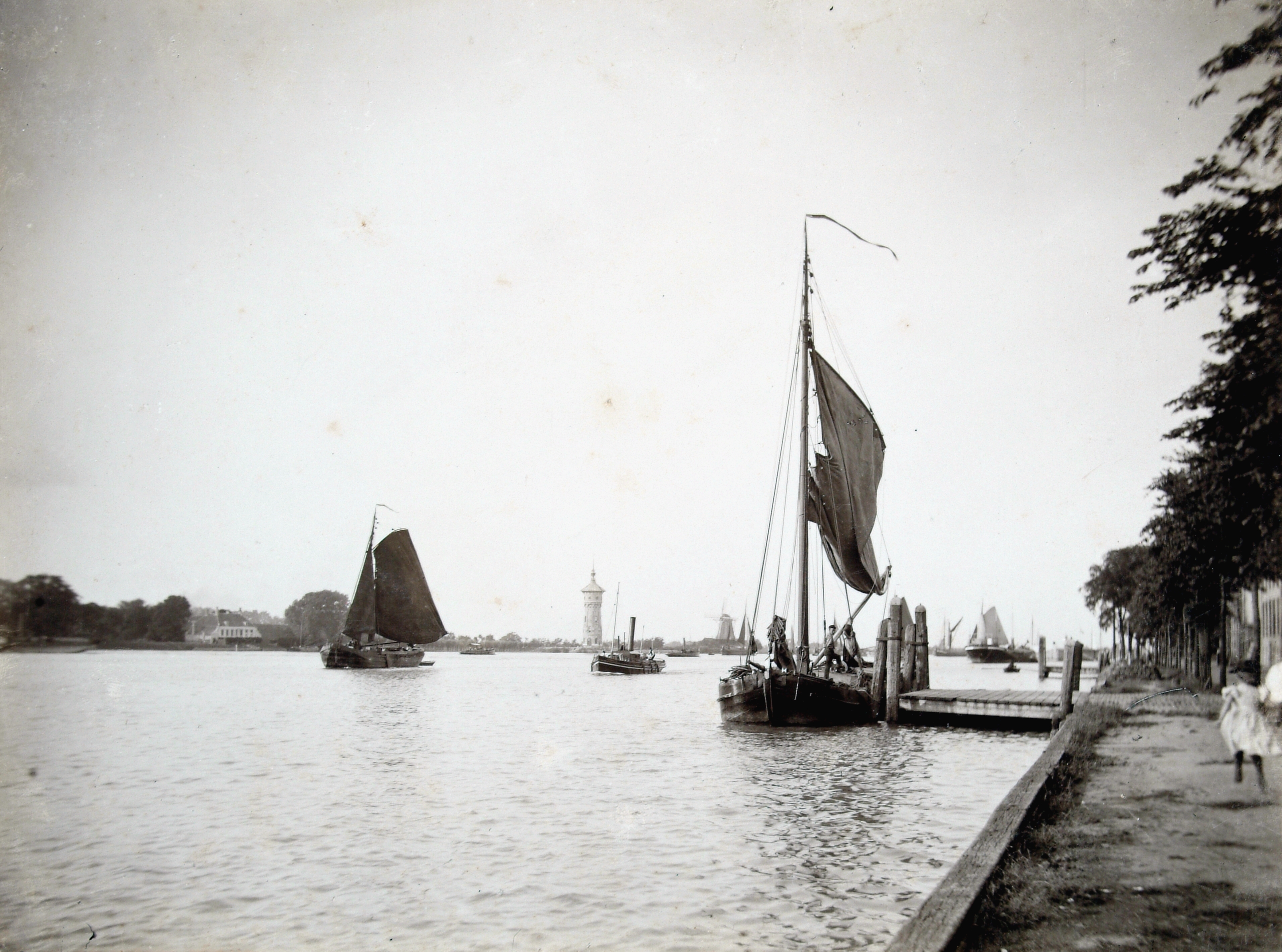 - riviergezichten stoomsleepboten watertorens zeilvaartuigen
