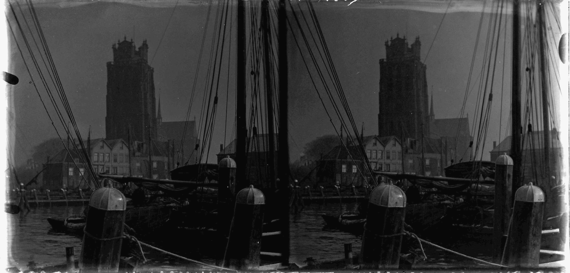 Stereofoto over de Bomhaven richting Mazelaarsstraat en Grote Kerk.
