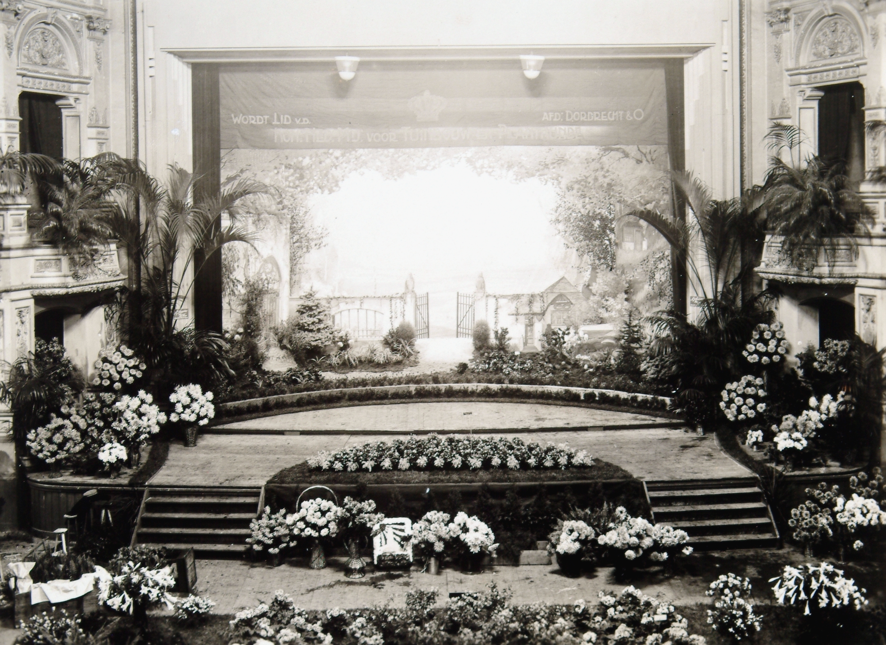 Met bloemen overladen podium van schouwburg Kunstmin. Deze inrichting was gemaakt voor een bijeenkomst van de Koninklijke Nederlandse Maatschappij voor Tuinbouw en Plantkunde, afdeling Dordrecht.
