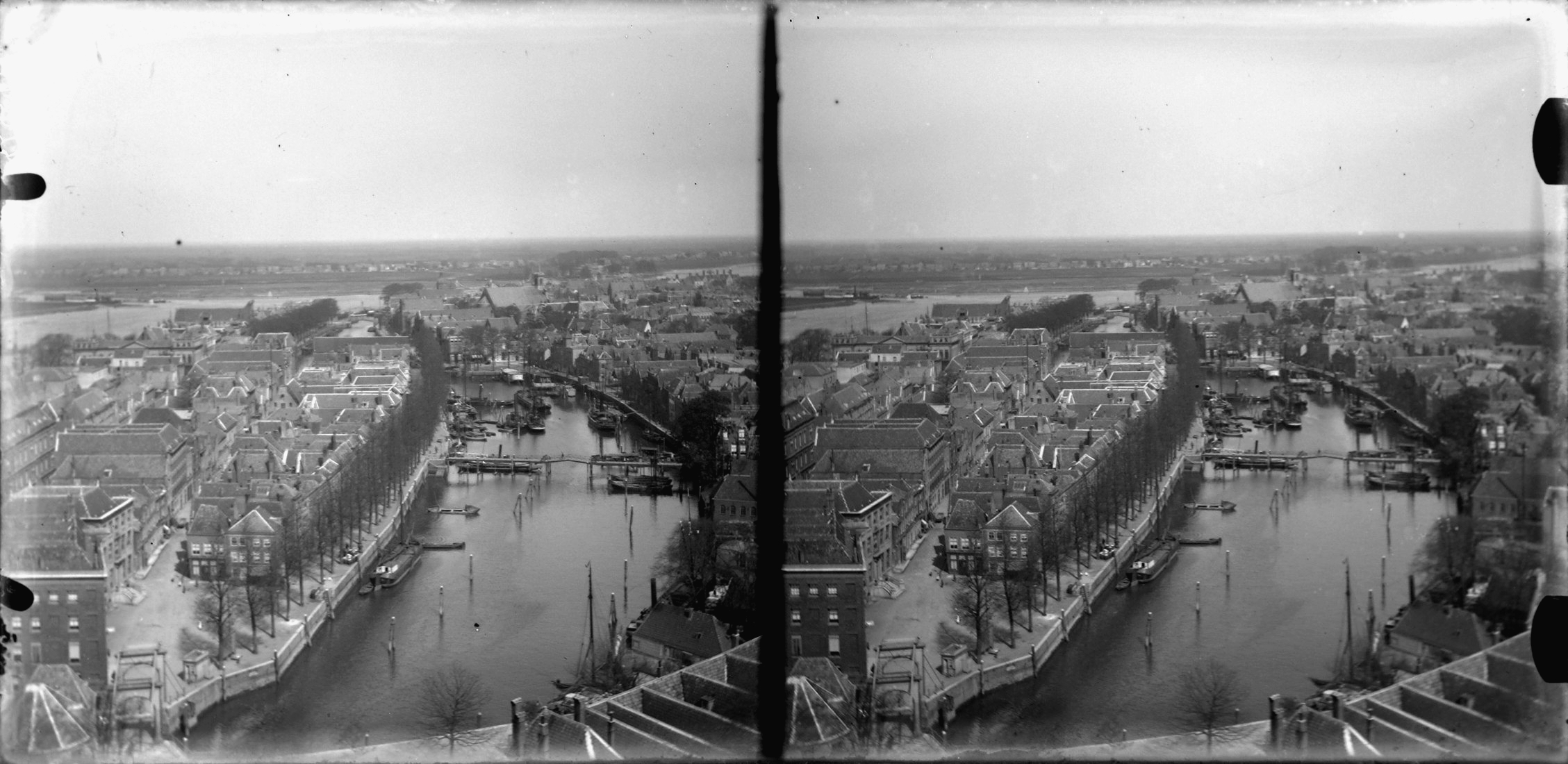 Stereofoto vanaf de Grote Kerk over de Nieuwe Haven tot aan de Aardappelmarkt. Links op de voorgrond de het rondeel Engelenburg, de Engelenburgerbrug en de Hoge Nieuwstraat in het verlengde daarvan. In het midden van de haven ligt de Lange IJzerenbrug, rechts ligt de Knolhaven.