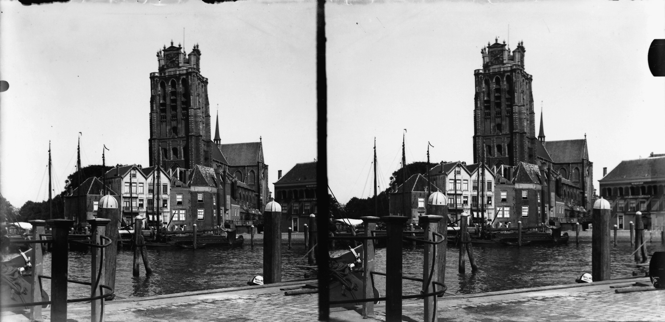 - Stereofoto vanaf de Bomkade over de Bomhaven naar de Korte Geldersekade en de Grote Kerk.
