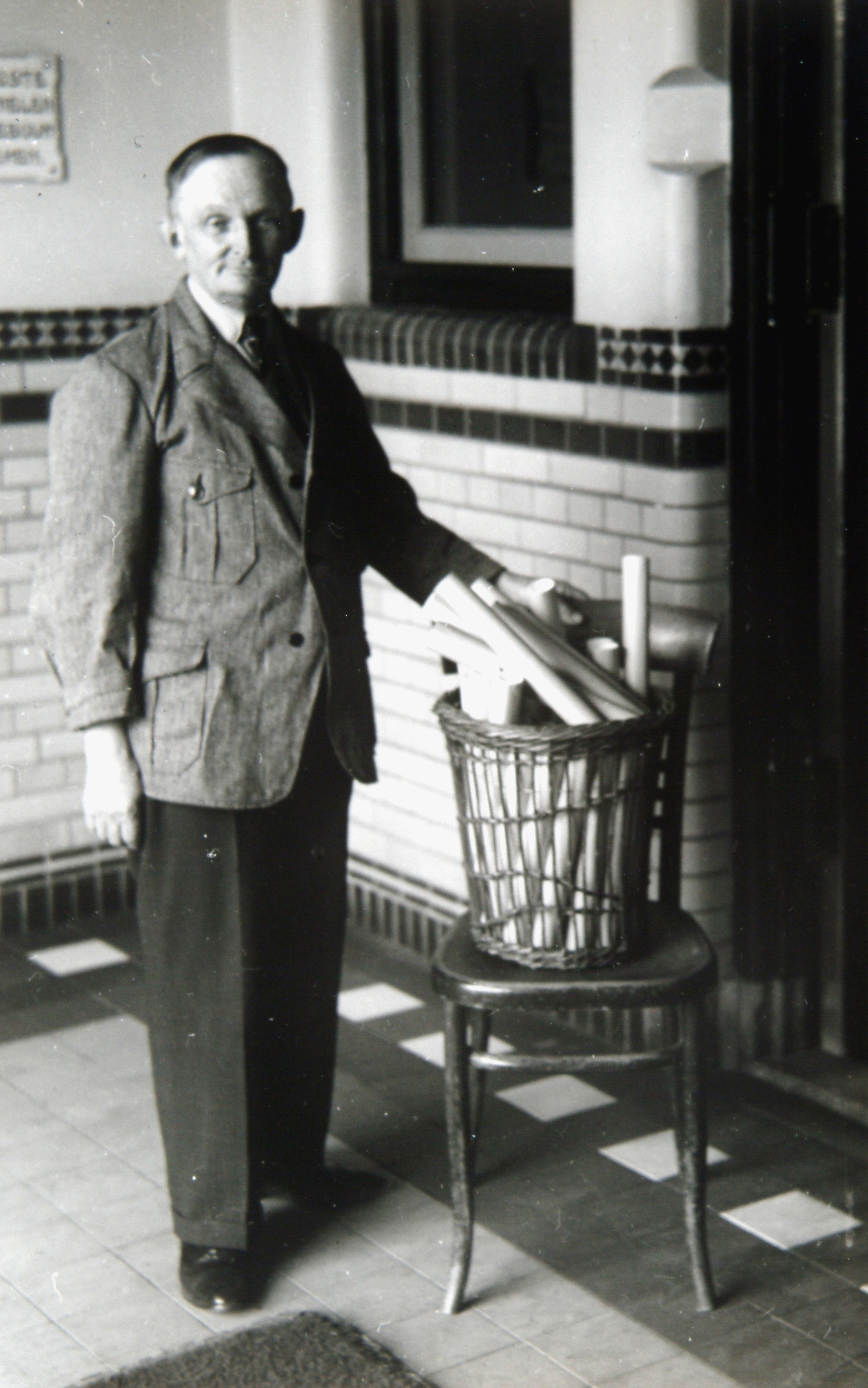 - De heer Th. Riske, conciërge op de Gem. H.B.S., in de gang van de school aan het Oranjepark.