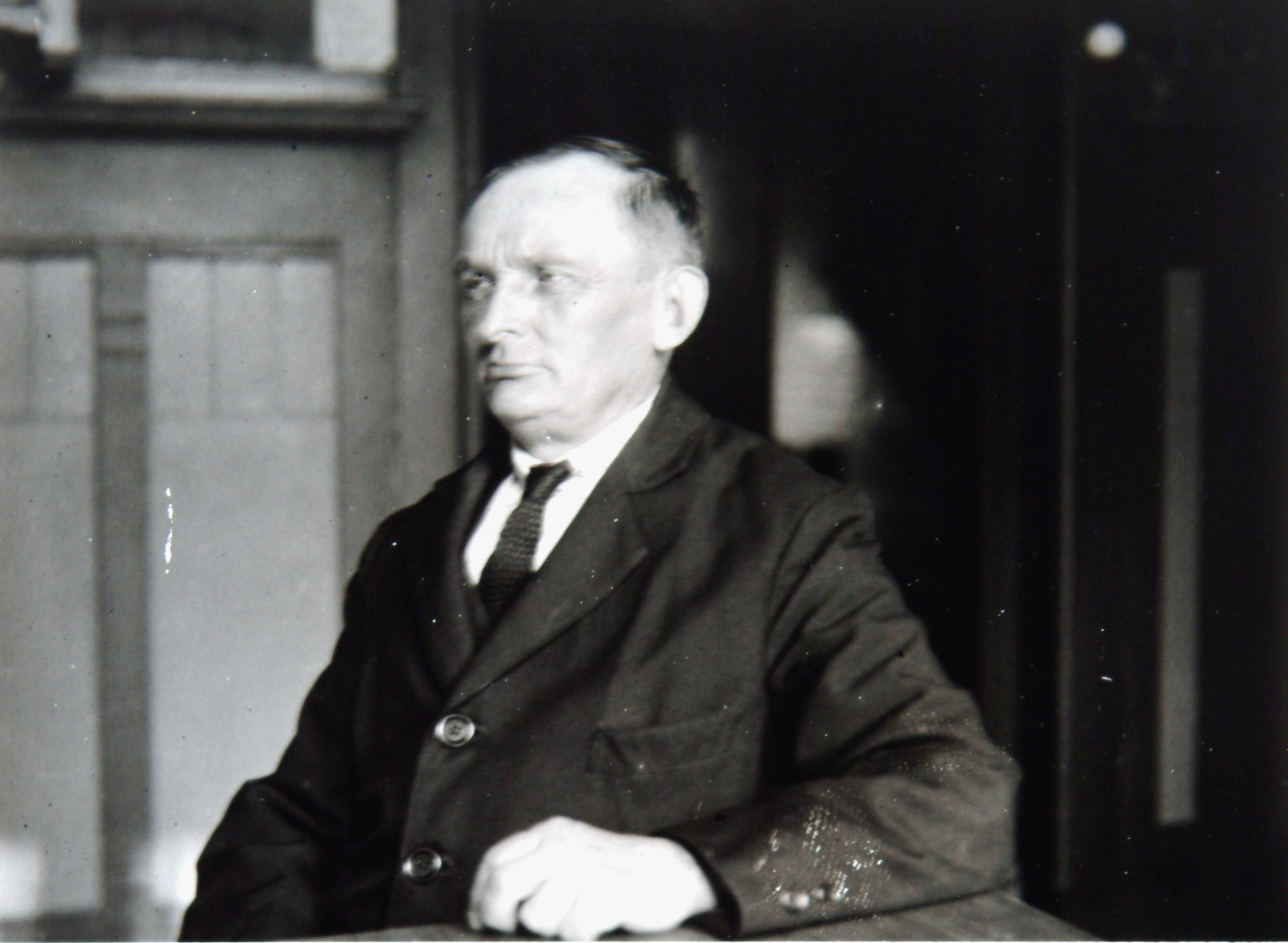 - De heer Th. Riske was 25 jaar conciërge op de Gem. H.B.S. in het Oranjepark. Hier zit hij in zijn kantoor.