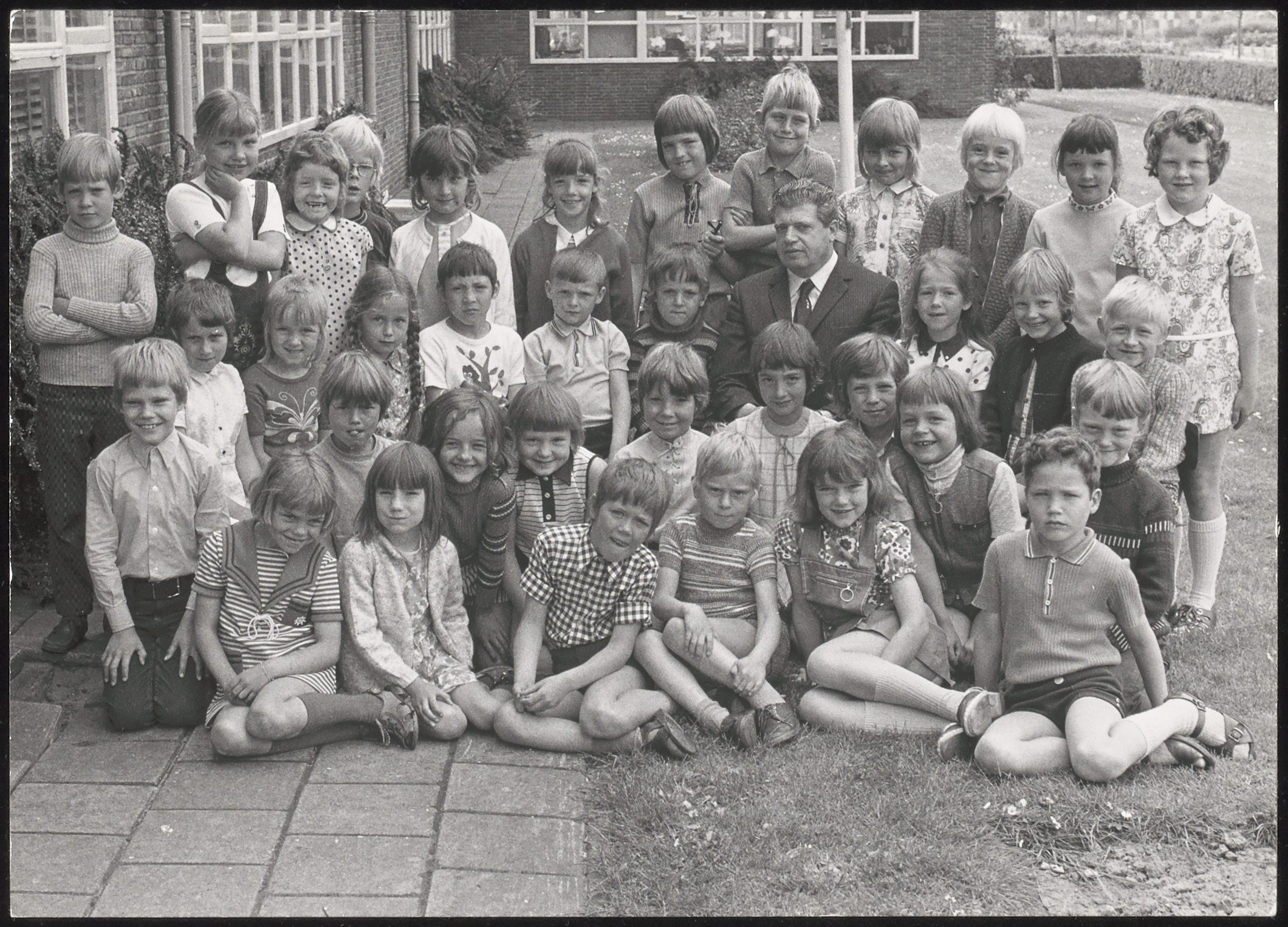 Meester Kabbedijk met zijn klas van de Welkerschool aan de Vlielanderstraat in Numansdorp.