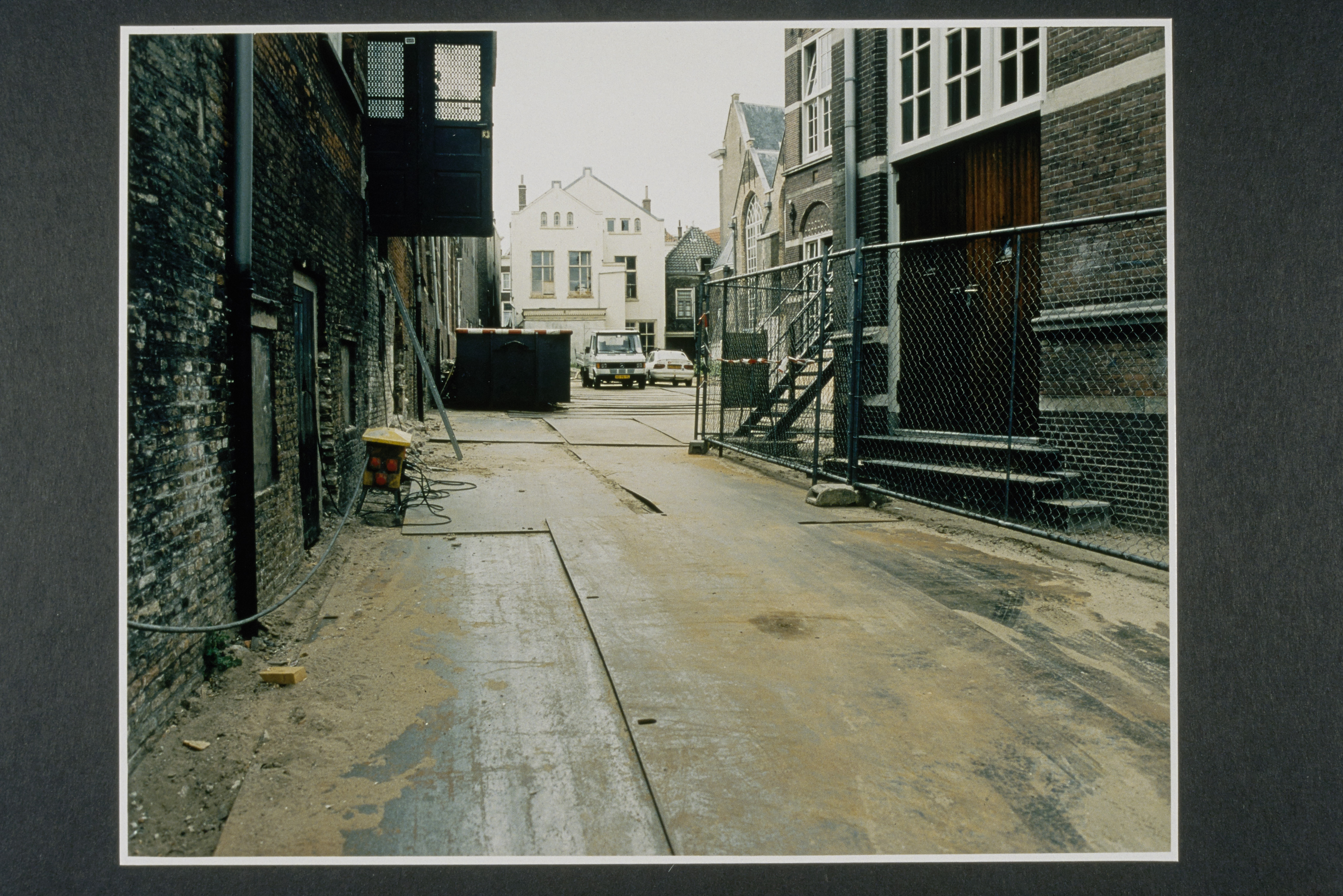 - Voormalige speelplaats van de Statenschool (rechts). Links de Berckepoort, gezien van de Hofstraat naar de Voorstraat.