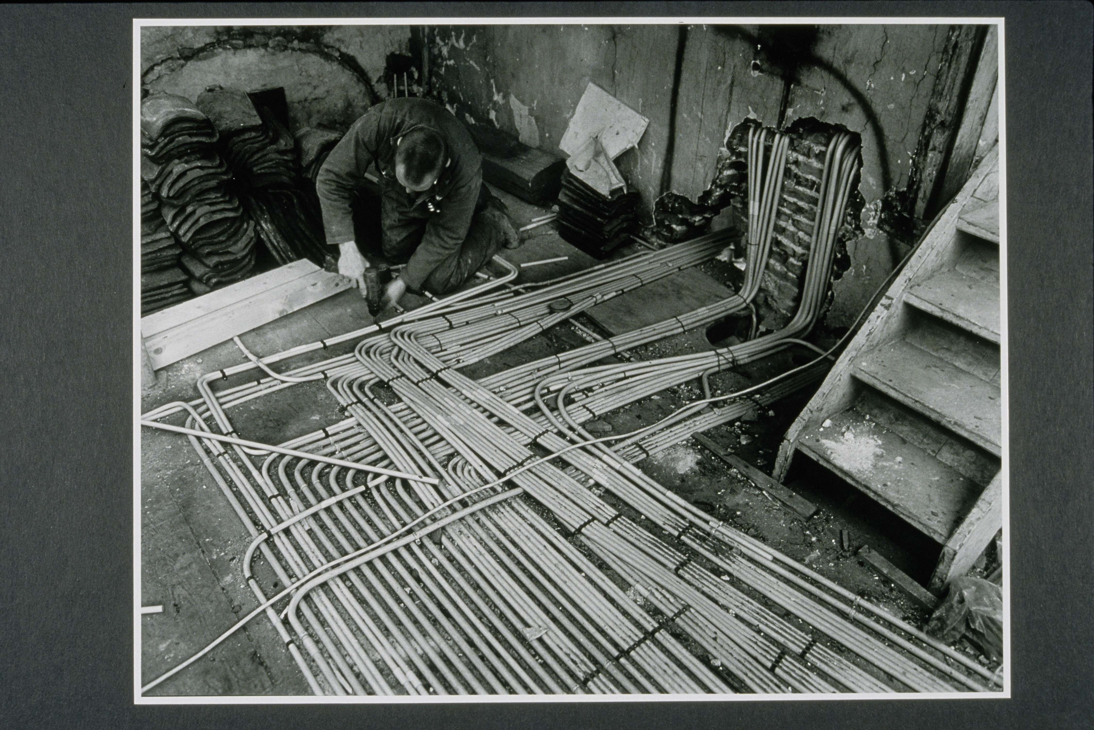 Restauratie en uitbreiding van de Berckepoort aan de Nieuwstraat. hier is men bezig met elektra leiding aanleggen.