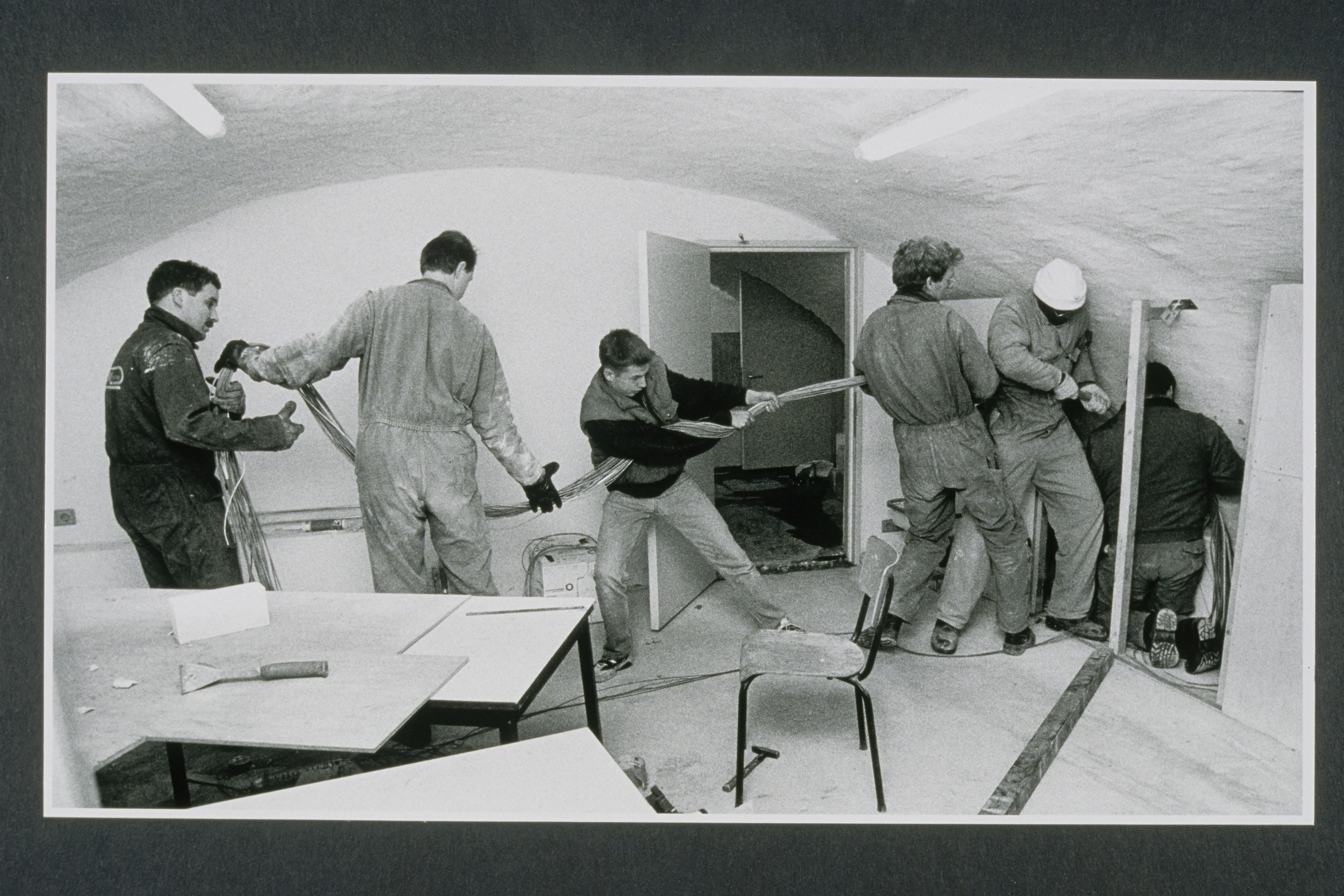 Restauratie en uitbreiding van de Berckepoort aan de Nieuwstraat. hier is men bezig met leiding trekken in de gewelven .