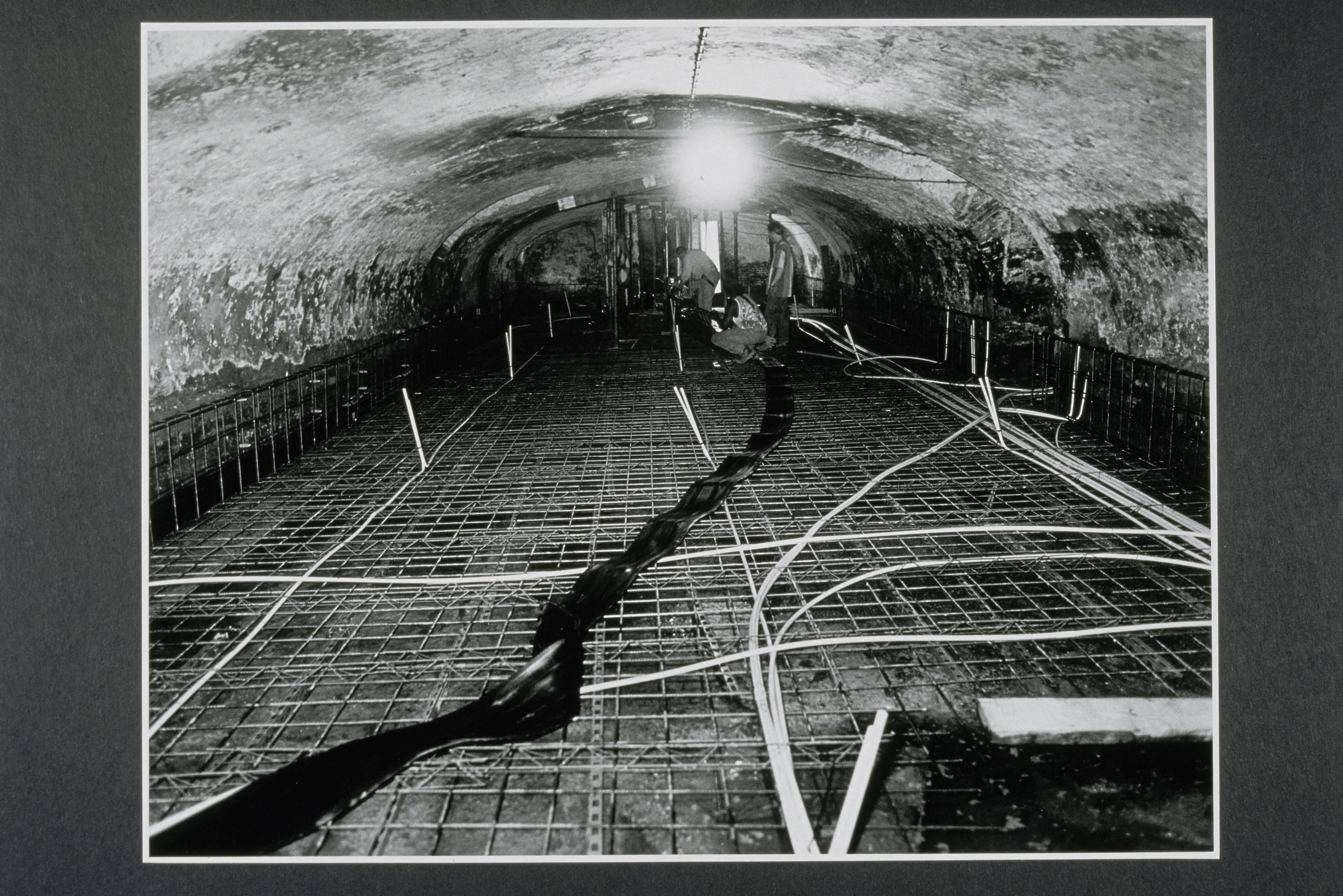 Restauratie en uitbreiding van de Berckepoort aan de Nieuwstraat. in 1997, hier is men bezig met vlechtmatten en elektraleiding voor er beton wordt gestort.
