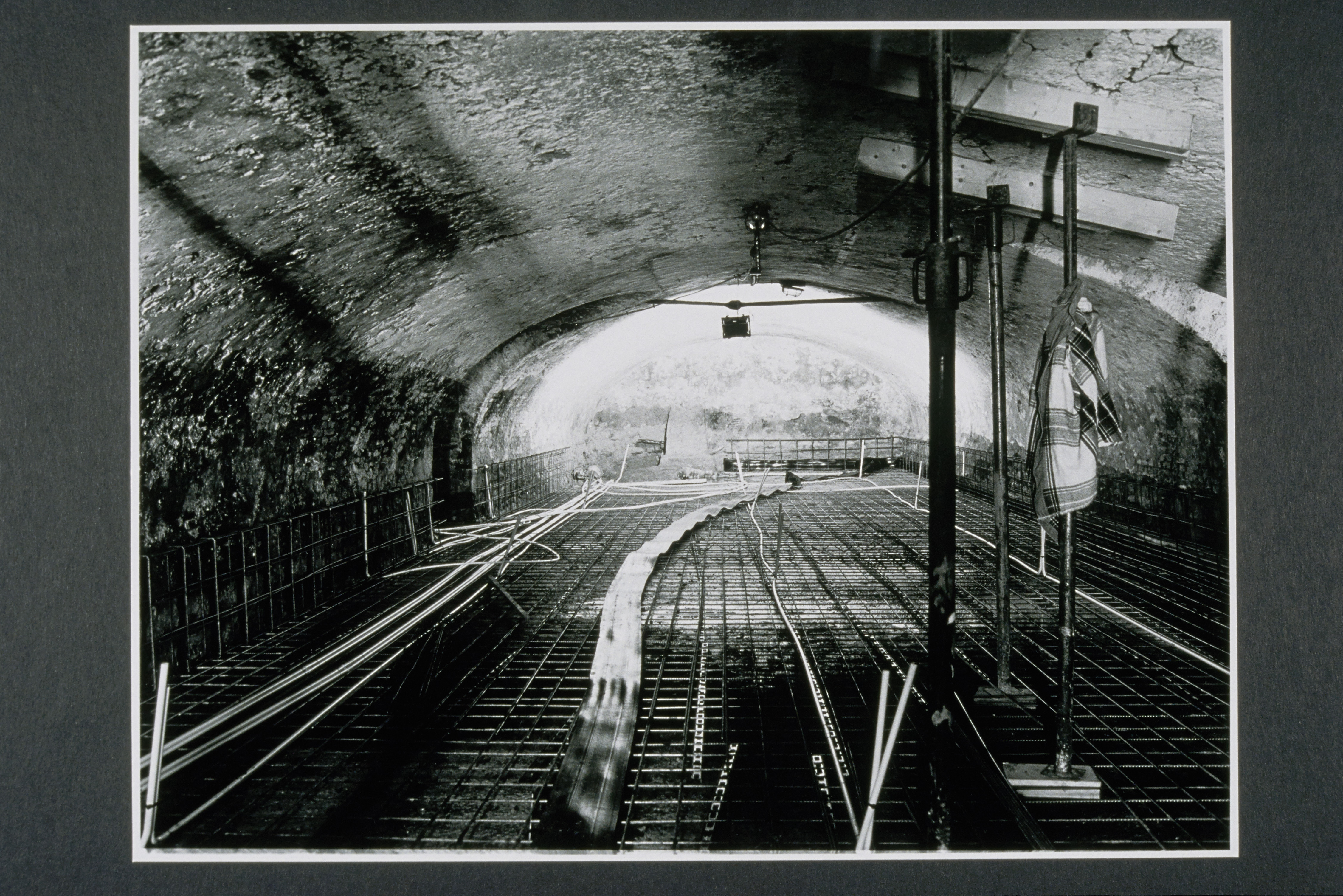 Restauratie en uitbreiding van de Berckepoort aan de Nieuwstraat. in 1997, hier is men bezig met vlechtmatten en elektraleiding voor er beton wordt gestort.