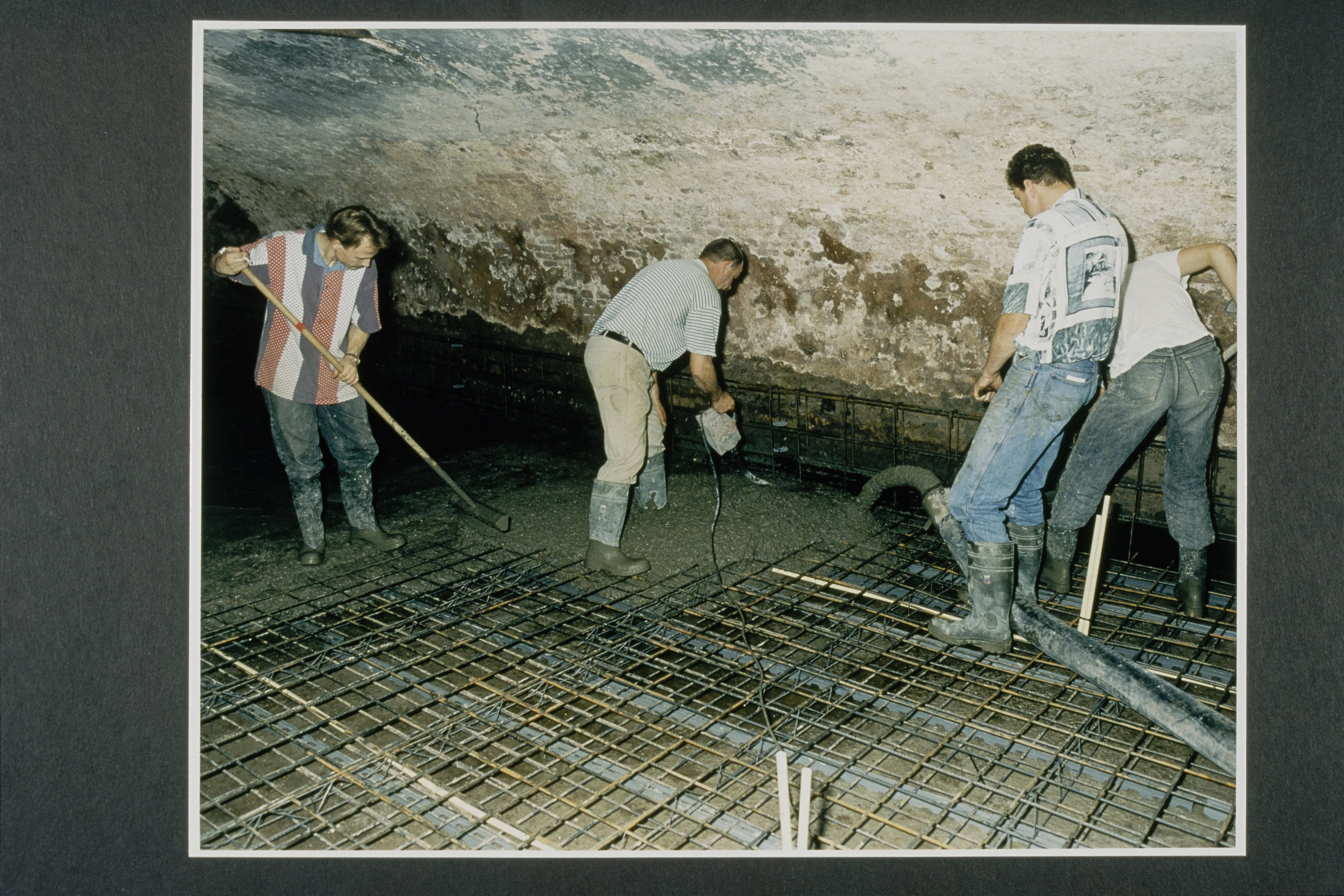 Restauratie en uitbreiding van de Berckepoort aan de Nieuwstraat. in 1997, hier is men bezig met vlechtmatten en elektraleiding voor er beton wordt gestort.