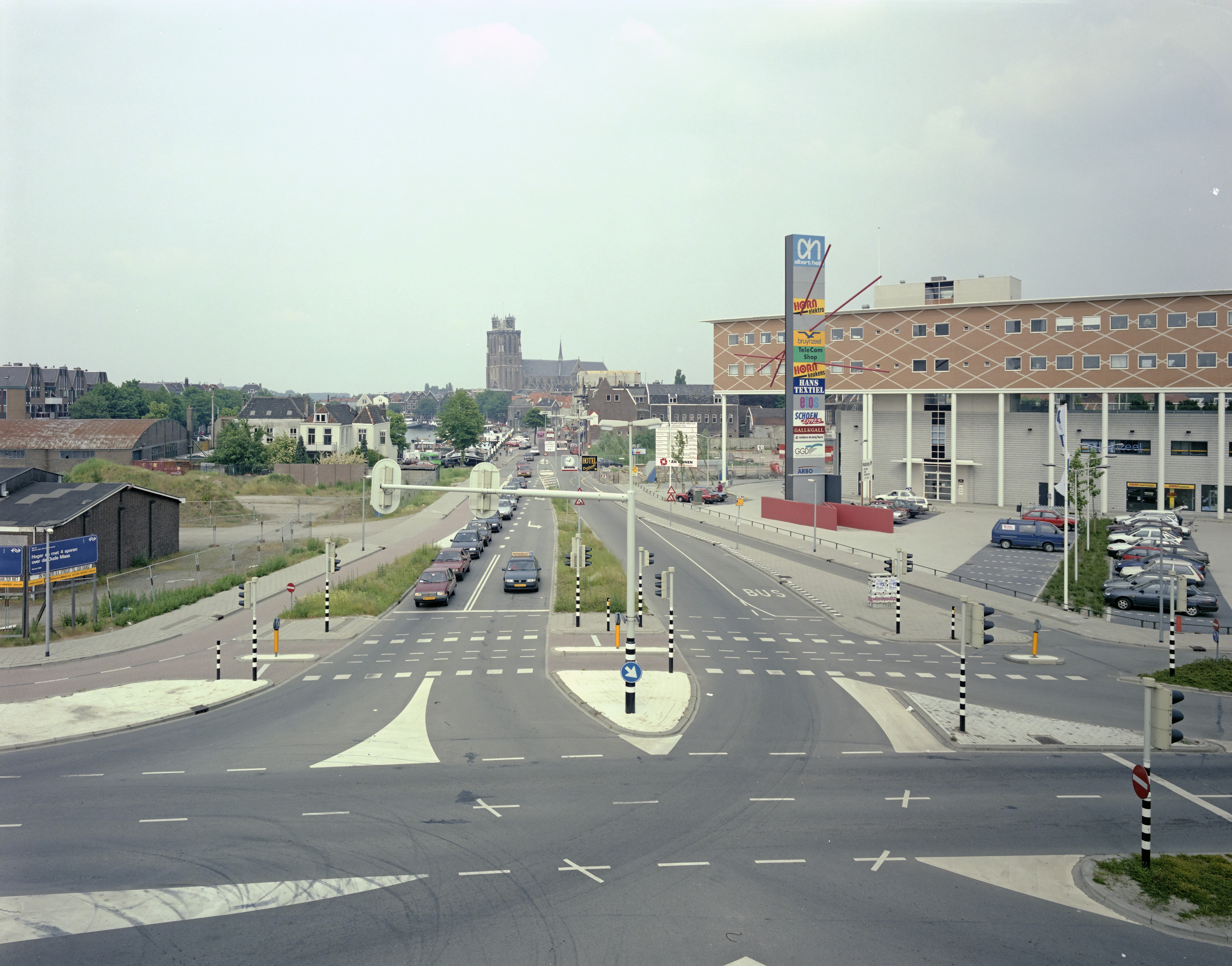 Het Wilgenbos vanaf de Korte Parallelweg. Rechts de Maasplaza en de Grote Kerk op de …