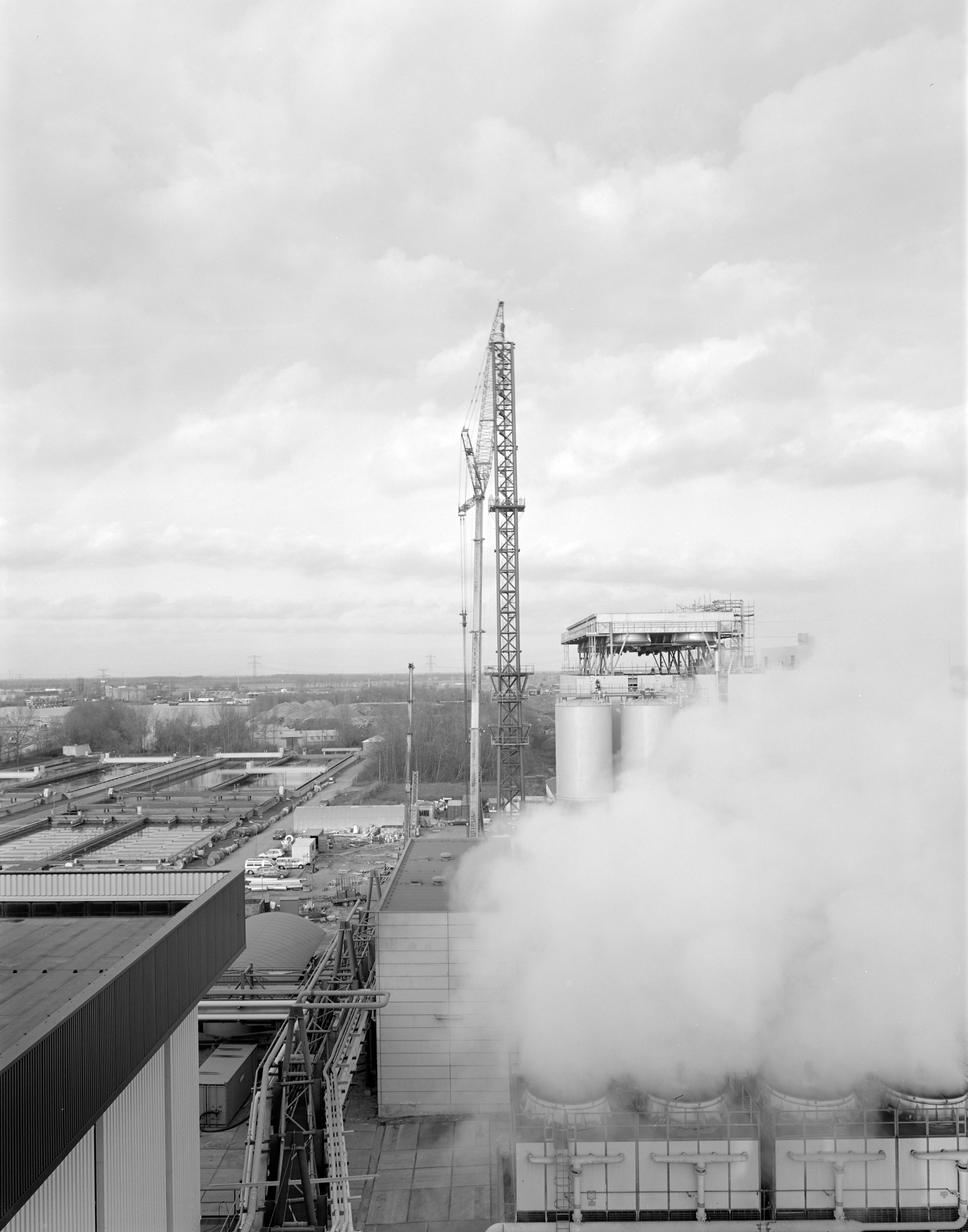 Op deze afbeelding zien we de bouw van de slibverbrandingsinstallatie (SVI) van de DRSH aan de Baanhoekweg 48. Bouwperiode 1992/1993. Eind 1993 is deze SVI in gebruik genomen. Tijdens de bouw zijn er veel foto’s gemaakt. Kraanbedrijf De Kil is bezig met het plaatsen van het topgedeelte van het buizenframe waar later de schoorsteenpijpen aan bevestigd worden. Zie eventueel ook afbeeldingen: 1280-1216 t/m 1280-1256, 1280-30109 t/m 1280-30130 en 1280-30181 t/m 1280-302244. Zowel GEVUDO als DRSH behoren in 2022 al een aantal jaren tot de HVC groep.