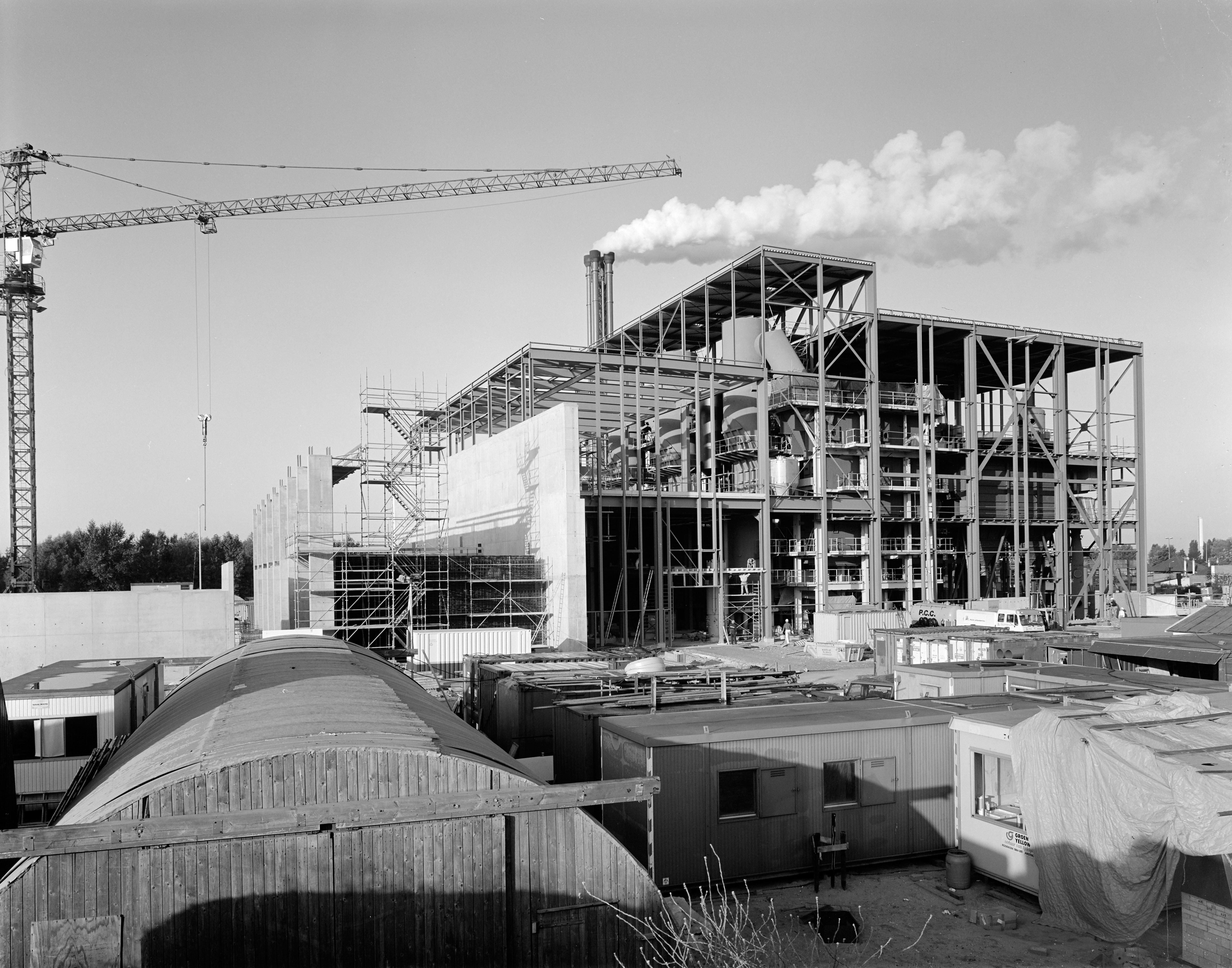 Op deze afbeelding zien we de bouw van de slibverbrandingsinstallatie (SVI) van de DRSH aan de Baanhoekweg 48. Bouwperiode 1992/1993. Eind 1993 is deze SVI in gebruik genomen. Tijdens de bouw zijn er veel foto’s gemaakt. Zie eventueel afbeeldingen: 1280-1216 t/m 1280-1256, 1280-30109 t/m 1280-30130 en 1280-30181 t/m 1280-302244. Zowel GEVUDO als DRSH behoren in 2022 al een aantal jaren tot de HVC groep. De rook komt uit de er achter gelegen afval verbrandings installatie (AVI) op de Baanhoekweg 40.